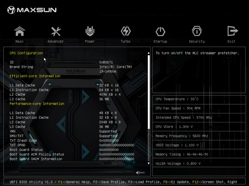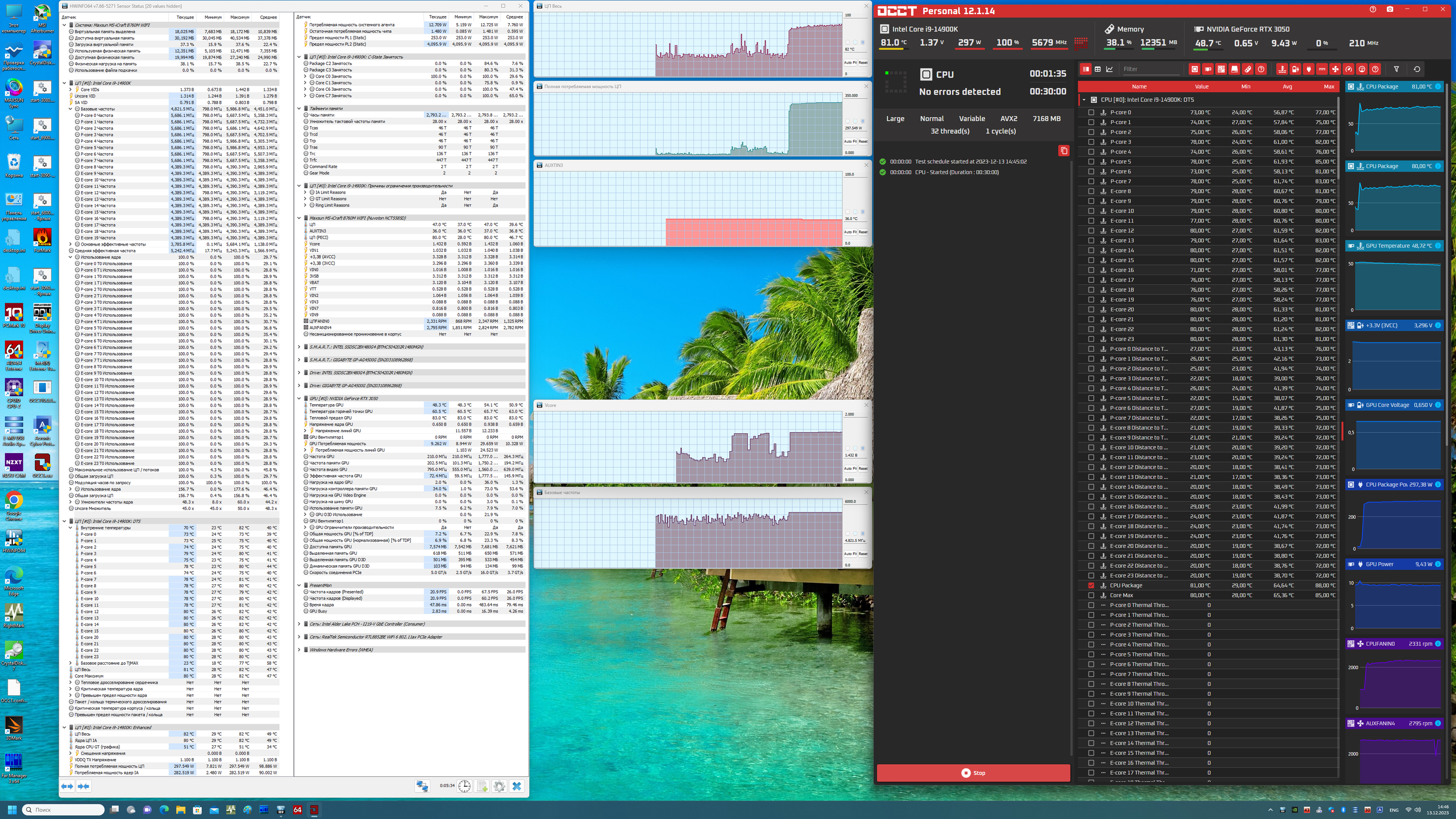 Скажу, что авторазгон весьма высокий, оно и логично: ведь система по умолчанию определяет возможности питания матплаты, а в данном случае система питания приличного уровня, несмотря на то, что подобные материнские платы явно не для самых топовых и требовательных процессоров, к которым относится Core i9-14900K. Что касается остальных параметров работы компонентов по нагреву, то следует отметить недостаток в наличии многих нужных термосенсоров. Прежде всего, это нагрев блока VRM, системного чипсета – или матплата не имеет термодатчиков в этих местах, или они нестандартны, и та же программа HWiNFO их не определяет. Ручное измерение нагрева VRM, чипсета показало, что нагрев не превышал допустимых значений (ниже 60°С).