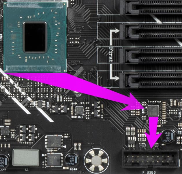 - 6 портов USB 3.2 Gen1: 2 реализованы через B760 и представлены внутренним разъемом на материнской плате на 2 порта); остальные 4 реализованы через хаб ASMedia ASM1074 (на него потрачена 1 линия PCIe 3.0 от B760) и представлены на задней панели 4 портами Type-A (синего цвета);