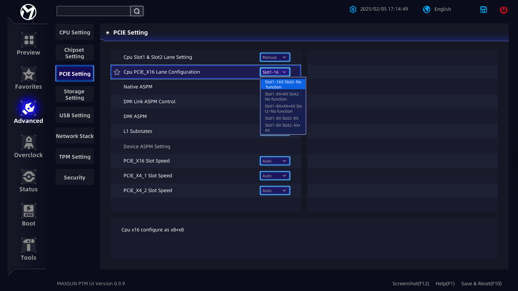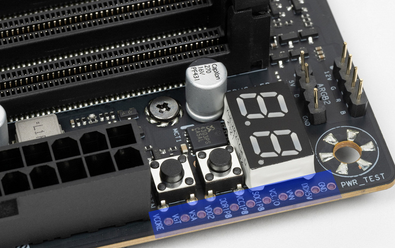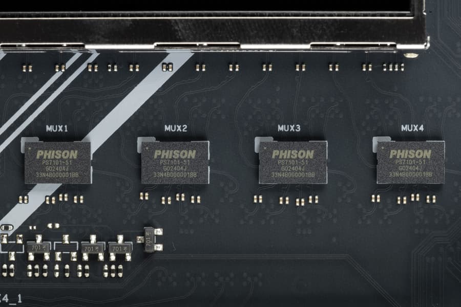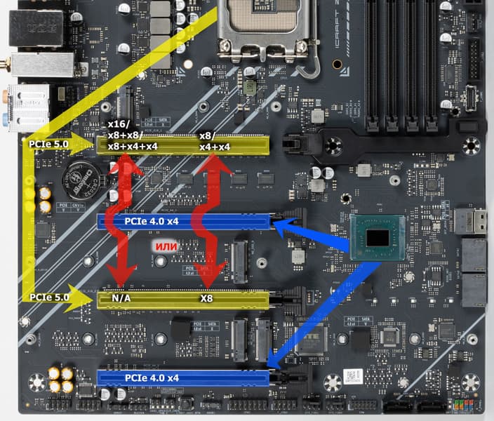 Как видим, перераспределение линий PCIe 5.0 этой материнки имеется, однако мультиплексоров нет, поэтому следует четко выставлять режимы работы слотов PCIe в BIOS.