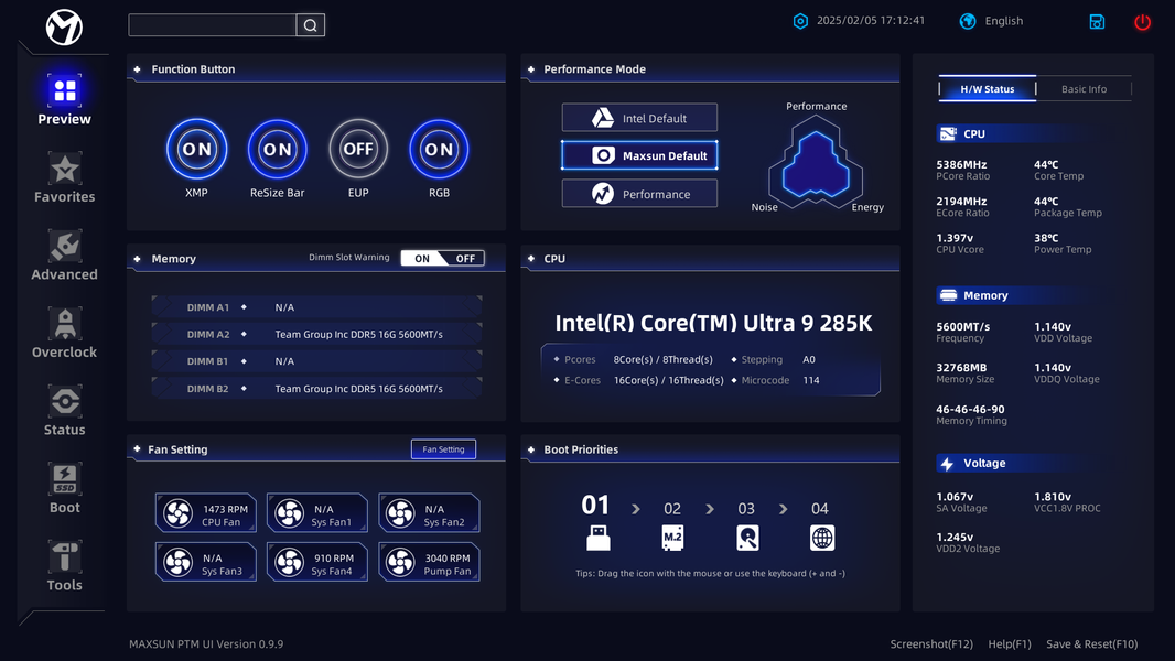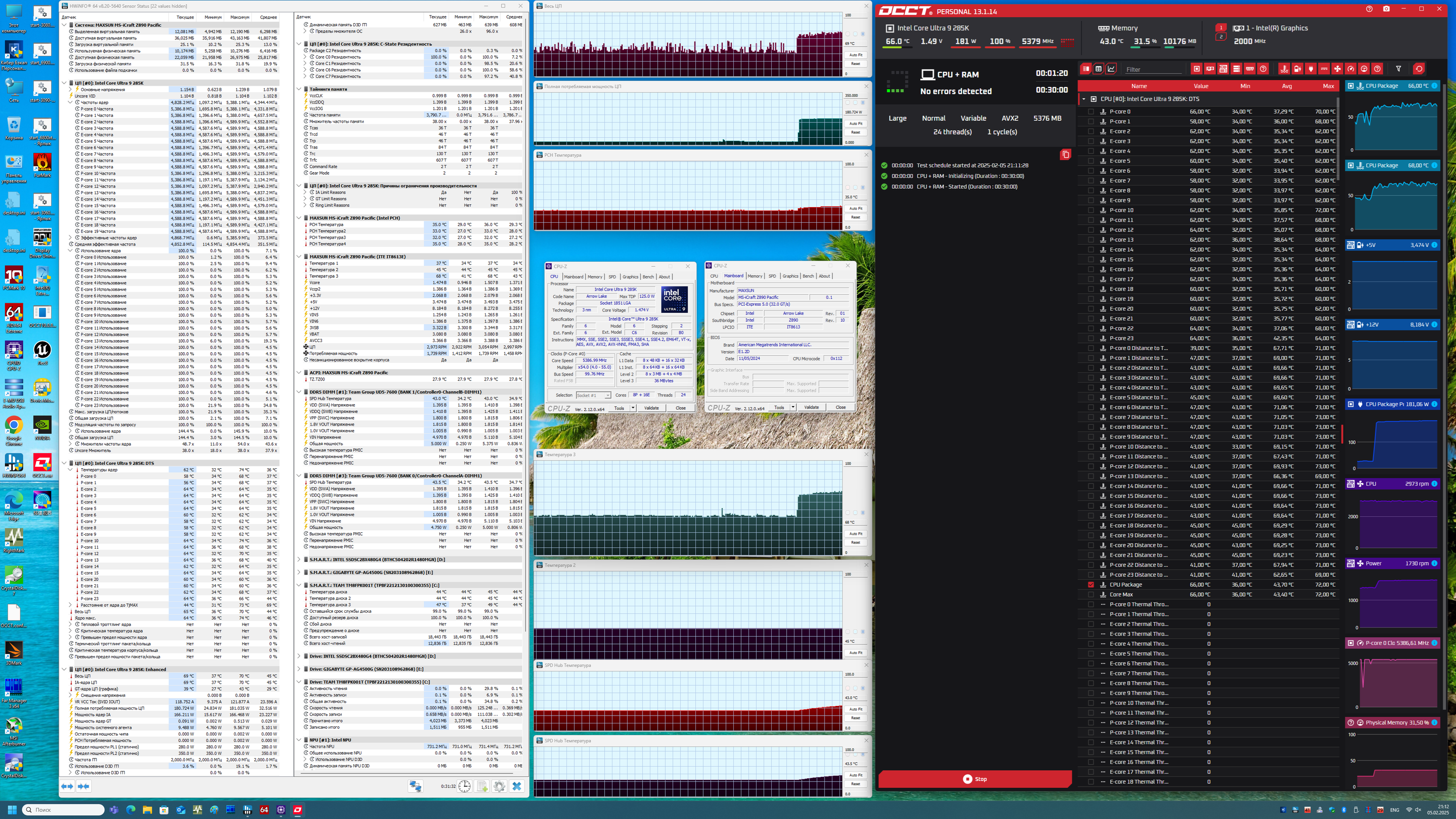 В режиме авторазгона мы получили до 5,4 ГГц по P-ядрам, и 4.6 ГГц по всем Е-ядрам. Напомню, что начиная с этого поколения процессоров, все ядра имеют по 1 потоку, то есть гипертрейдинга (многопоточности) теперь нет. Потребление процессора достигало 180 Вт. Мы видим в целом, что авторазгон не максимальный (мы встречали и 5.7 ГГц по P-ядрам). Безусловно, в данном случае играет и тот факт, что профиль Maxsun основан на настройках от Intel, сильно лимитирующих авторазгон, и то, что система питания у данной платы явно не самая мощная (по сути 8 параллельных фаз с DrMOS до 50А, здесь суммарный потенциал по току примерно раза в 2 – 2.5 меньше, чем у флагманских плат от иных производителей). В принципе, такого авторазгона достаточно для 99% потребителей, и с учетом стоимости данной материнки (по сравнению с аналогами от маститых производителей), мы выносим положительный вердикт в целом.