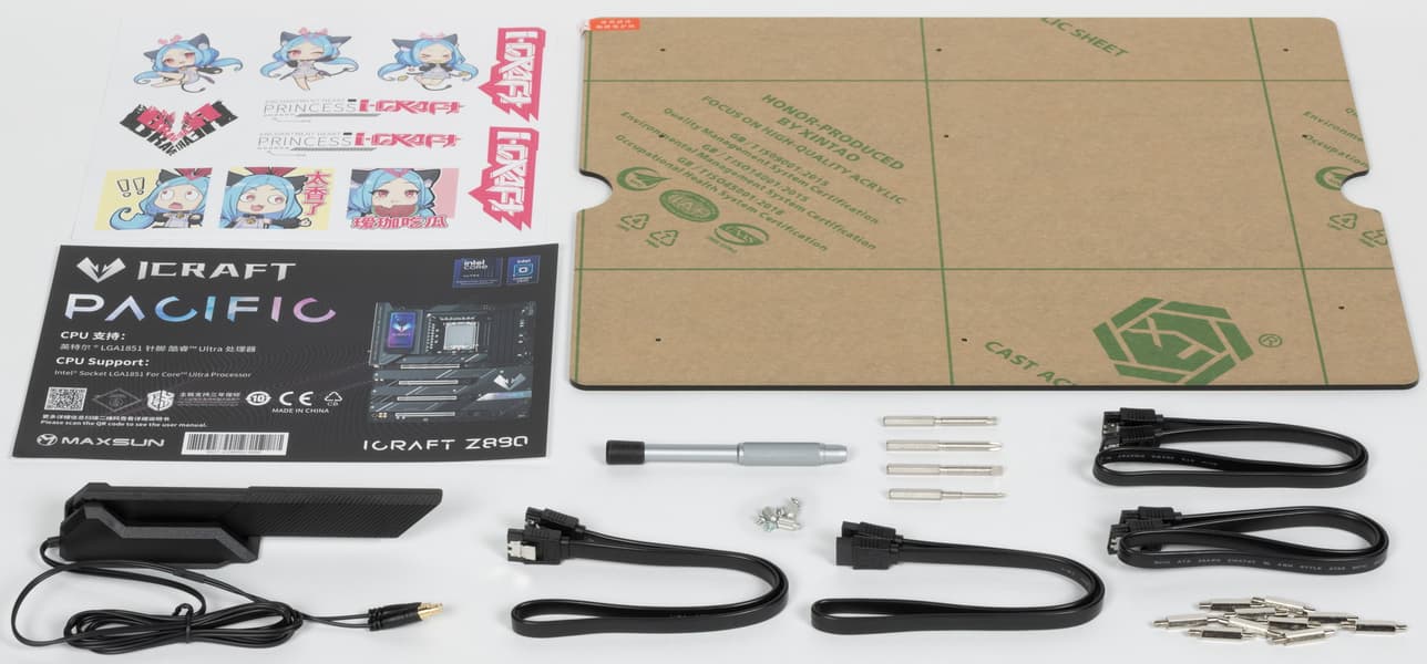 Maxsun iCraft Z890 Pacific поставляется в большой и красивой коробке с ручкой для переноски. Комплект размещен под платой в отдельном отсеке, при этом в качестве разделителя используется.. акриловый лист (ни разу не встречал подобных комплектов, обычно чисто картонные разделители отсеков).