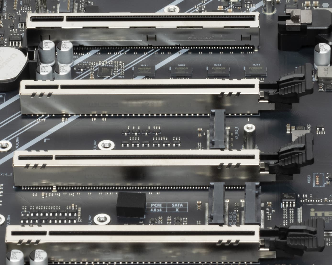 Всего на плате есть 4 слота: два PCIe x16_1/3 (для видеокарт или других устройств) и два также «длинных» PCIe x16_2/4, но фактически имеющих по 4 линии PCIe 4.0.