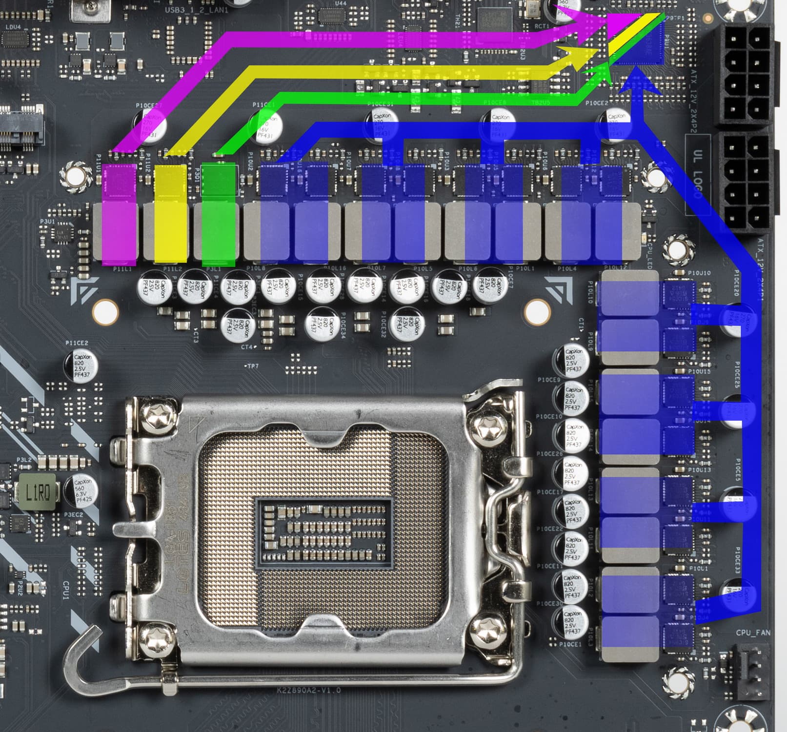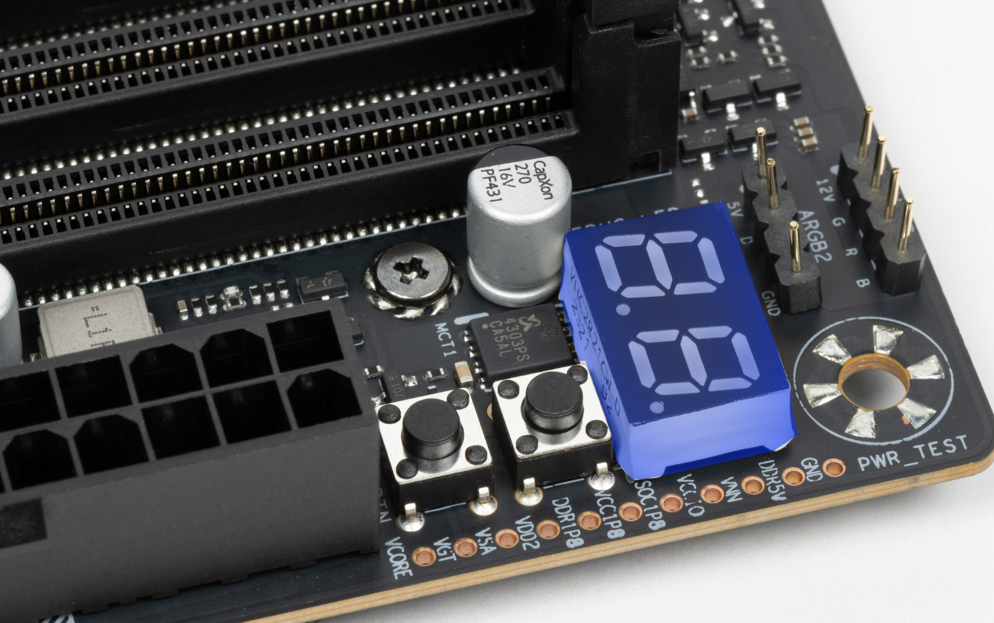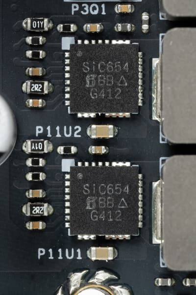 Каждый канал фазы VCore, iGPU и VNNAON имеет суперферритовый дроссель и SiC654 DrMOS от Vishay на 50 А.