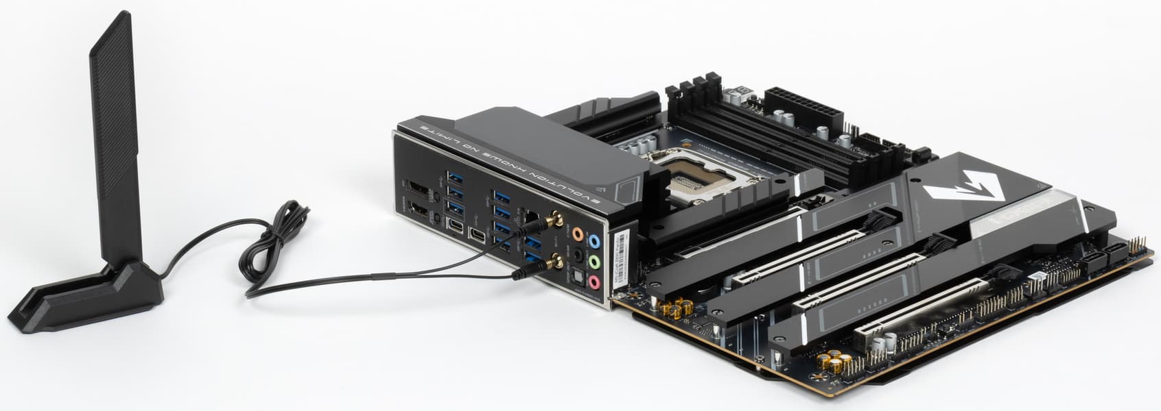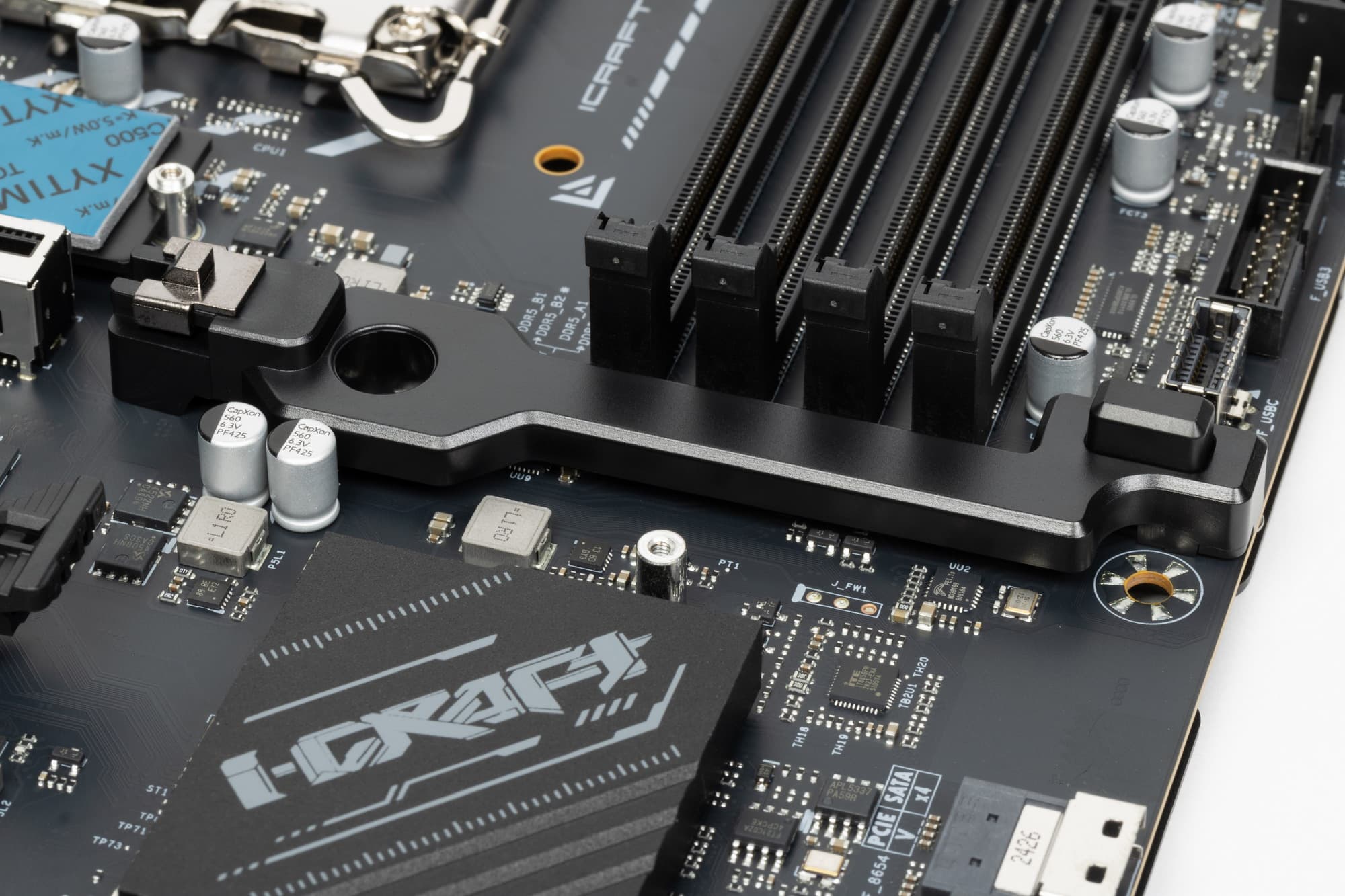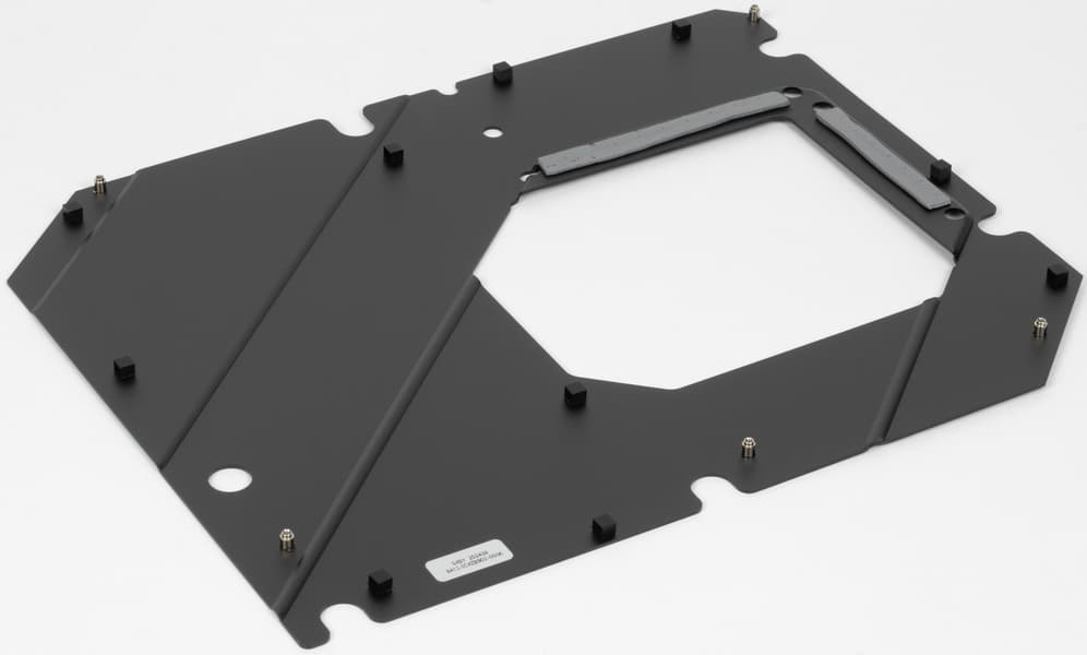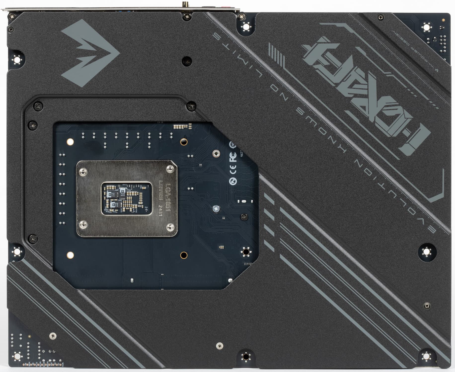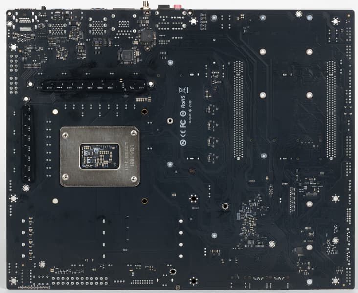 Напомню, что материнская плата имеет бэкплейт из алюминия с наноуглеродным антиэлектропроводным покрытием. Данная пластина не только защищает оборотную сторону матплаты от повреждений, служит элементом жесткости конструкции, но также участвует в охлаждении тыльной стороны платы в области VRM.