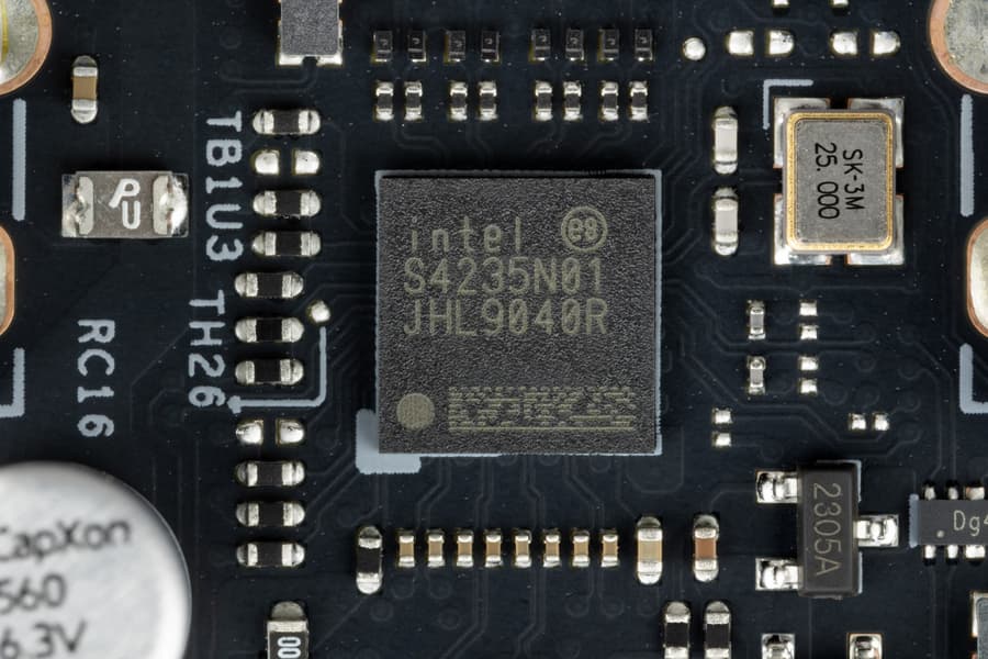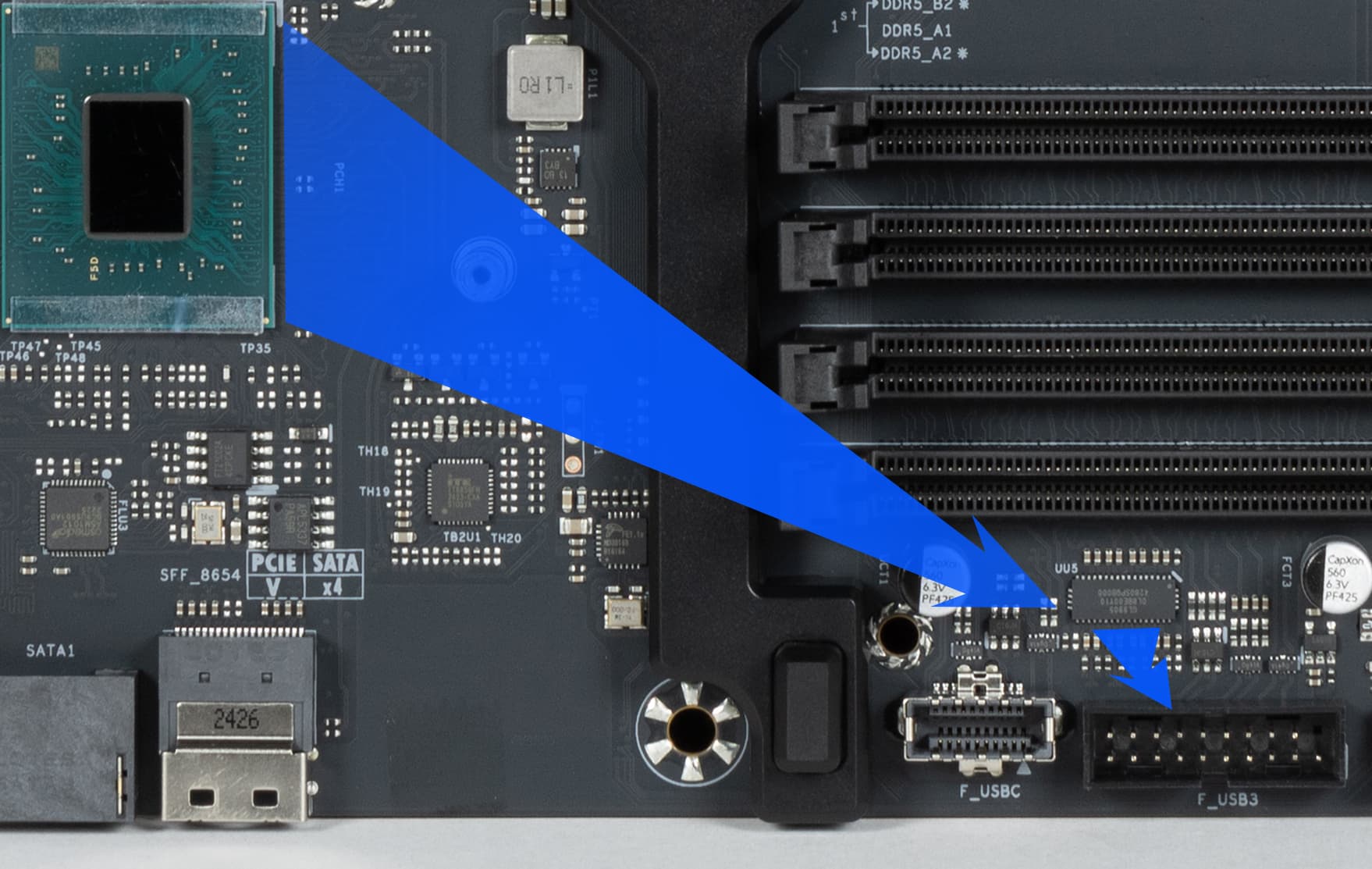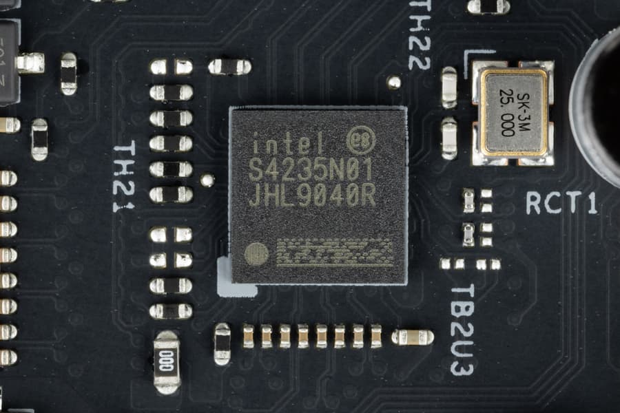 Для устойчивой скоростной передачи по протоколам USB4/TB4 на матплате имеются два усилителя (ре-драйвера) от той же компании Intel.