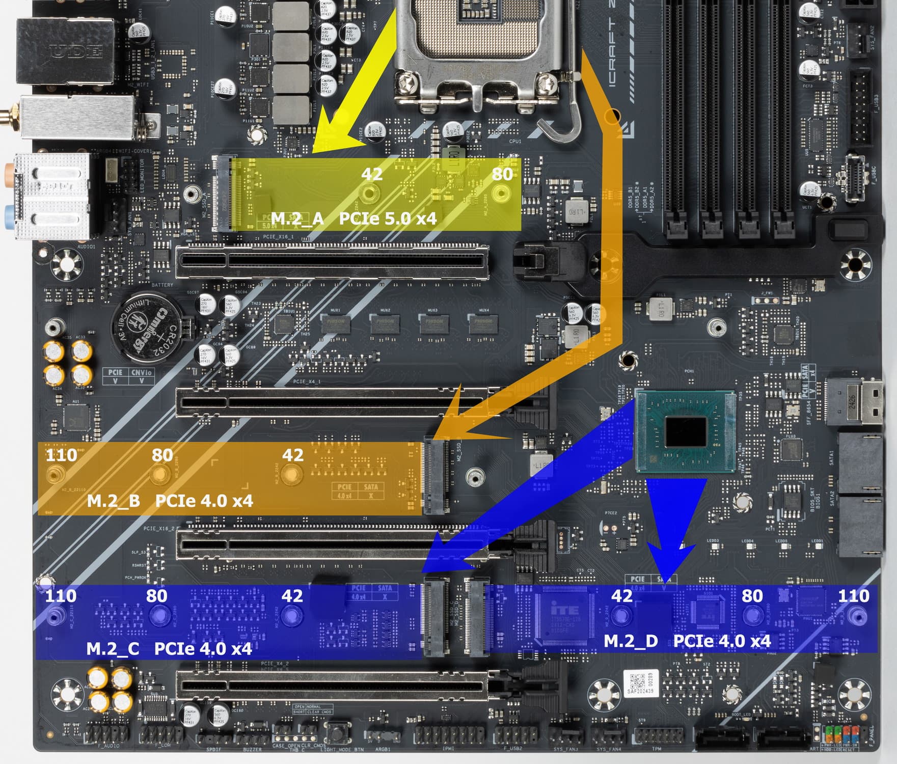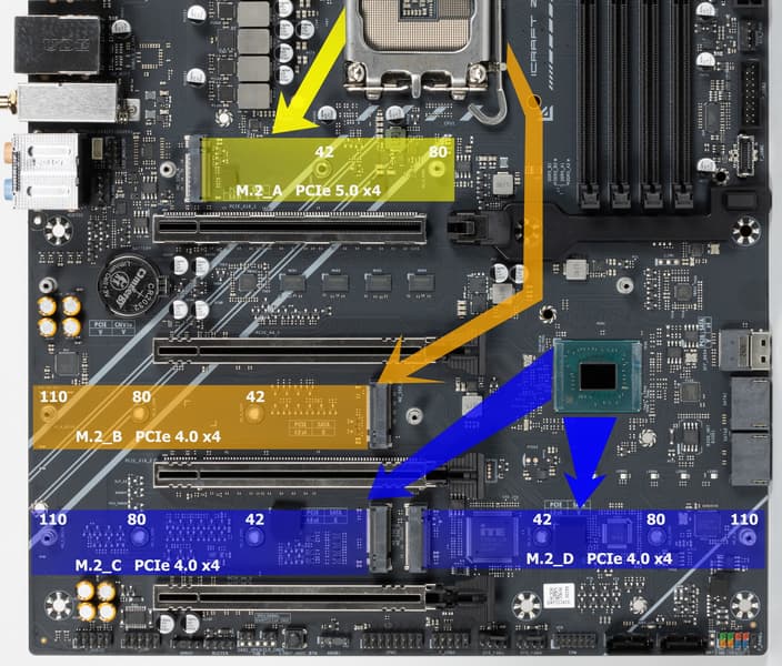 Третий и четвертый слоты M.2 (M.2_C, M.2_D) получают данные от чипсета Z890, а первые два — от CPU, при этом M.2_A получает PCIe 5.0, а M.2_B получает от процессора PCIe 4.0.