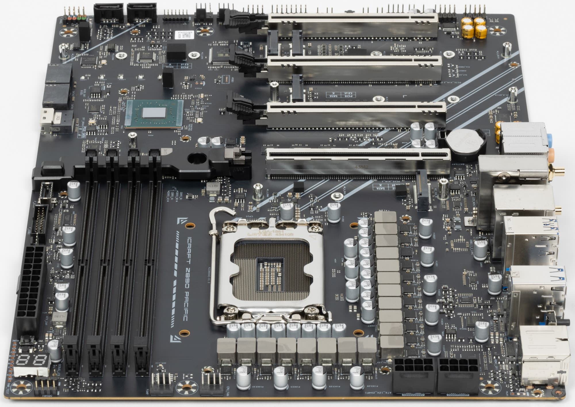 Форм-фактор ATX имеет размеры до 305×244 мм, а E-ATX — до 305×330 мм. Материнская плата Maxsun iCraft Z890 Pacific имеет размеры 305×244 мм, поэтому выполнена в форм-факторе ATX, и на ней имеются 9 монтажных отверстий для установки в корпус.
