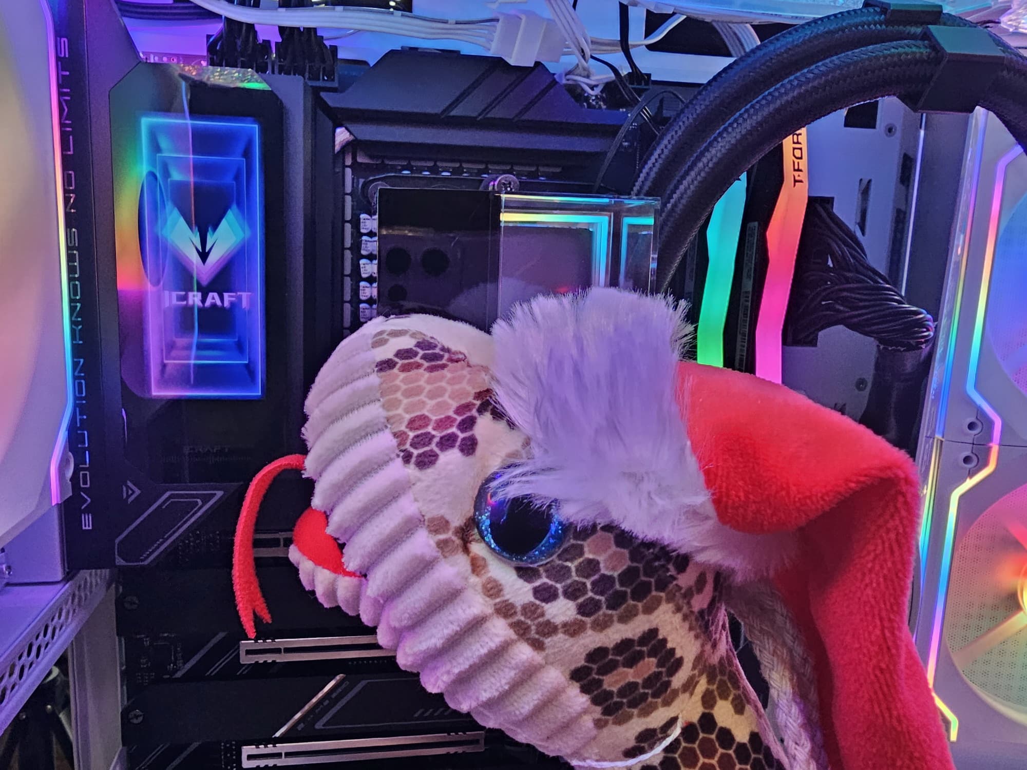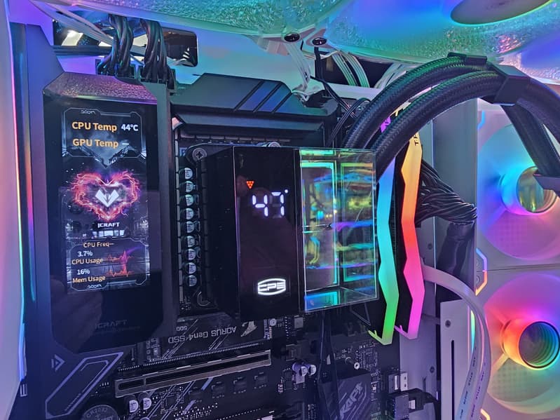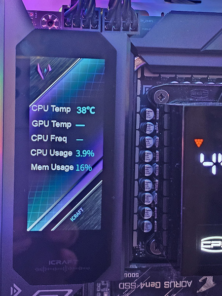 Радиатор VRM, идущий вдоль заднего блока портов, имеет кожух, оснащенный LCD экраном.