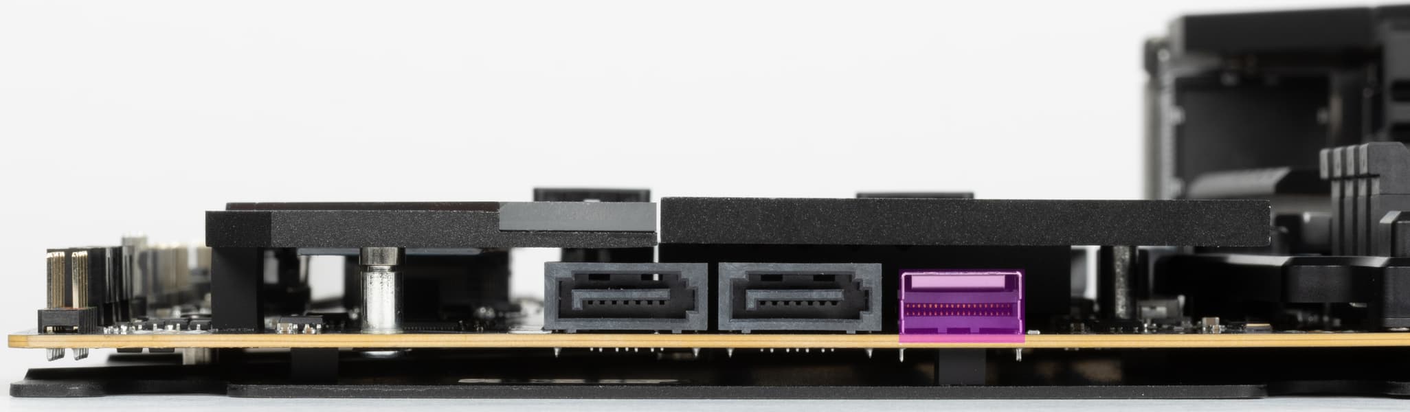 Рядом с двумя портами SATA имеется и относительно новый, и редко встречающийся порт SlimSAS (отмечен фиолетовым цветом) – это сверхскоростное соединение, обычно применяемое в серверах и устройствах хранения данных. SAS – последовательный единый интерфейс (Serial Attached SCSI) для подключения разных устройств хранения данных. SlimSAS – это мини-версия данного порта. В данном случае SlimSAS поддерживает подключение еще одного NVMe накопителя PCIe 4.0 x4, либо 4х портов SATA. Интерфейсные кабели для таких целей приобретаются отдельно.