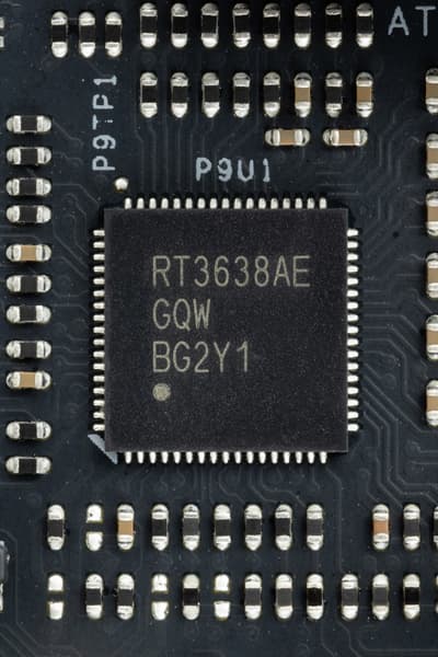 Управление всей схемой возложено на ШИМ-контроллер Richtek RT3638 (он поддерживает до 12 фаз, поэтому фазы питания VCore идут по параллельной схеме 8х2, плюс три остальные фазы, всего реально задействовано 11 фаз).