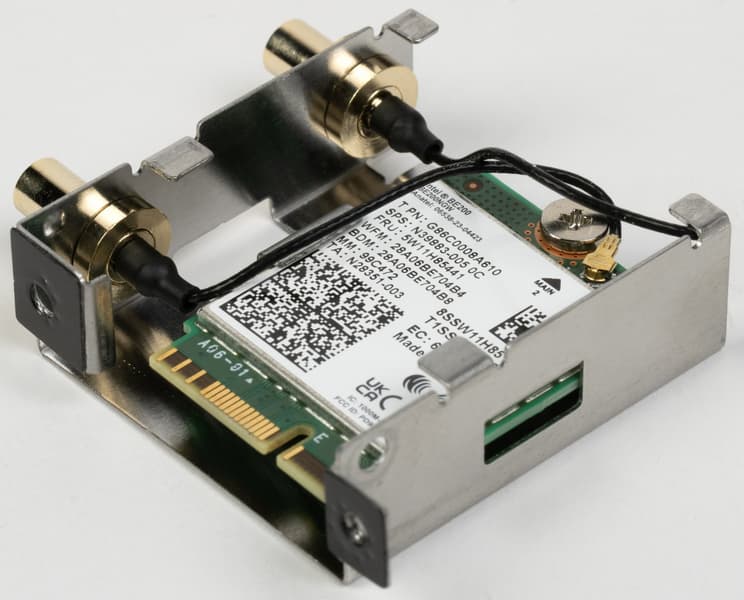Имеется и комплексный беспроводной адаптер на контроллере Intel BE200, через который реализованы Wi-Fi 7 (802.11a/b/g/n/ac/ax/be, 2,4/5/6 ГГц) и Bluetooth 5.4. Он установлен в слот M.2 (E-key), и его разъемы для выносных антенн выведены на заднюю панель.