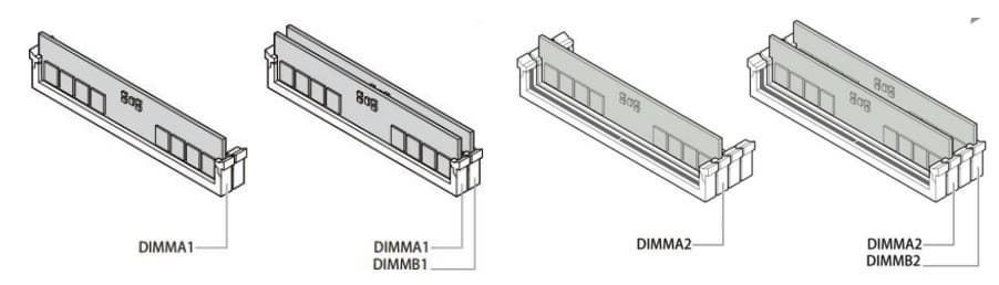 Для установки модулей памяти на плате Maxsun имеется четыре DIMM-слота (для работы памяти в Dual Channel в случае использования всего 2 модулей их следует устанавливать в А2 и B2.