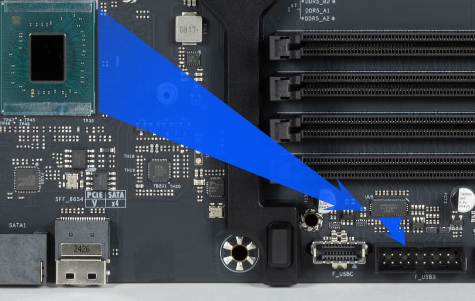- 1 порт USB 3.2 Gen2x2: реализован с помощью Z890 и представлен одним внутренним портом Type-C (для подключения к соответствующему разъему на передней панели корпуса);