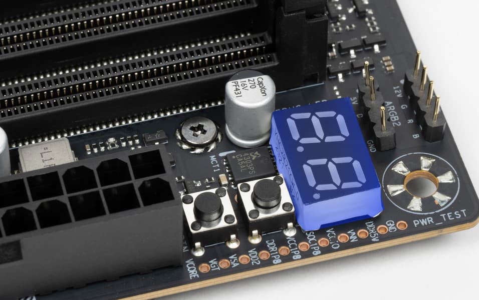 В арсенале платы также есть 4 порта SATA, один универсальный порт SlimSAS и 6 разъемов для вентиляторов. Система питания процессора относительно мощная, способная обеспечить работу любых совместимых процессоров с некоторым запасом на разгон. Плата имеет грамотную систему охлаждения каждого потенциально греющегося элемента, включая накопители в слотах M.2. Сетевые возможности включают скоростной проводной контроллер 5 Гбит/с и один самый современный беспроводной — Wi-Fi 7 + Bluetooth 5.4. В числе плюсов платы можно упомянуть широкие возможности для подключения дополнительных RGB-устройств. Также отметим ЖК-экранчик на кожухе блока задних портов, куда можно выводить мониторинг состояния платы, а также собственные изображения и анимации. В комплекте поставки есть отверточка с несколькими битами.