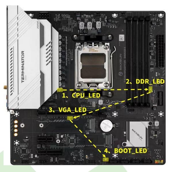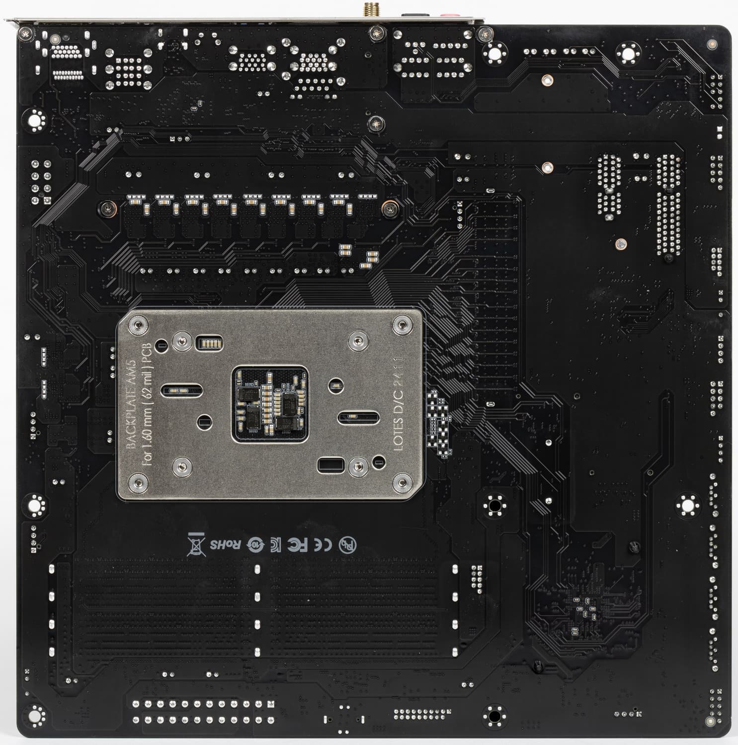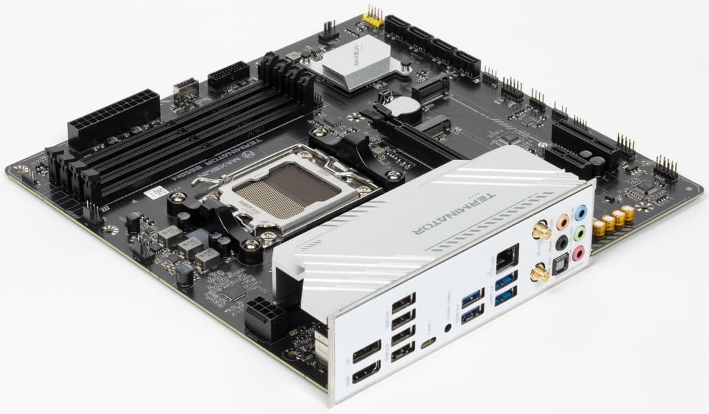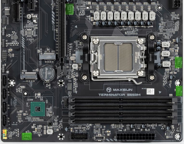 Форм-фактор Micro-ATX имеет размеры 244×244 мм, ATX до 305×244 мм, а E-ATX — до 305×330 мм. Материнская плата Maxsun Terminator B650M WiFi6 имеет размеры 244×244 мм, поэтому выполнена в форм-факторе Micro-ATX, и на ней имеются 8 монтажных отверстий для установки в корпус.