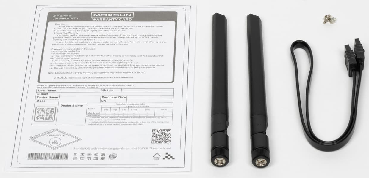 Кроме традиционных элементов типа руководства пользователя и кабелей SATA, комплект поставки включает. антенны для беспроводной связи и набор «стойка+винтик» для слотов M.2.