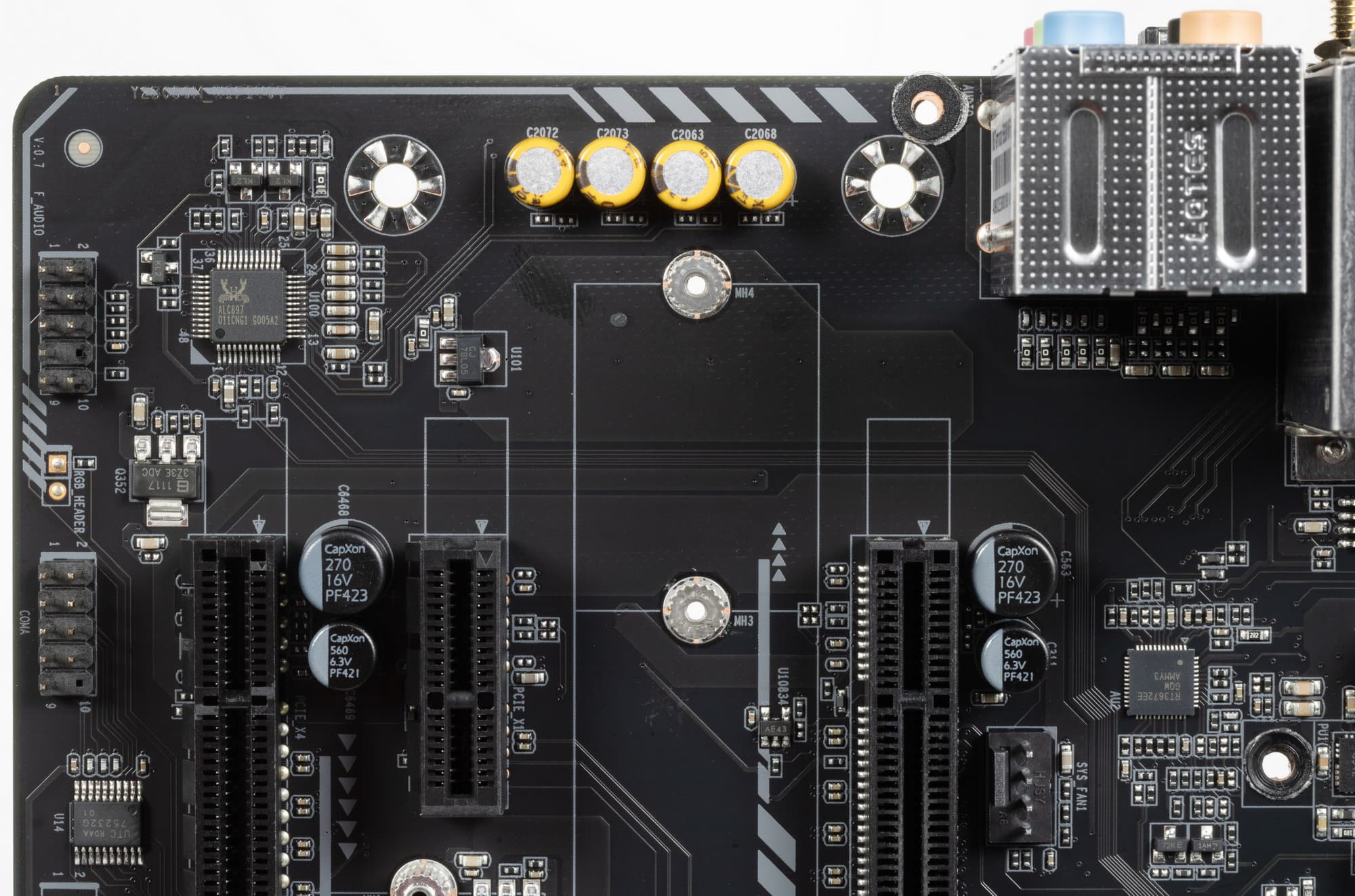 Аудиотракт вынесен на угловую часть платы, не пересекается с другими элементами. Все аудиоразъемы на задней панели имеют привычную цветовую окраску.