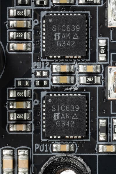 Каждая фаза VCore и SoC имеет по транзисторной сборке SiC639 от Vishay (до 50А).