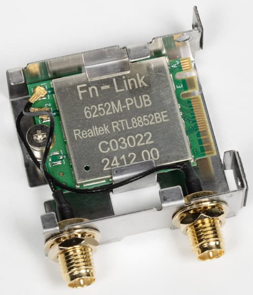 Имеется и комплексный беспроводной адаптер на контроллере Realtek RTL8852, через который реализованы Wi-Fi 6E (802.11a/b/g/n/ac/ax) и Bluetooth 5.2. Он установлен в слот M.2 (E-key), и его разъемы для привинчивания выносных антенн выведены на заднюю панель.