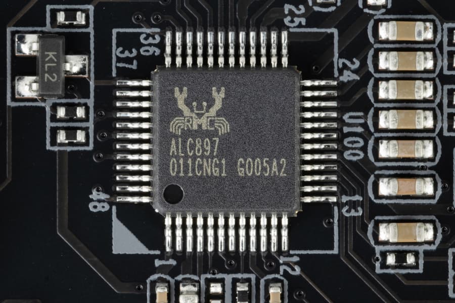Мы знаем, что почти во всех современных материнских платах звуковым кодеком является продукт от Realtek, обеспечивающий вывод звука по схемам до 7.1, в последнее время это стал ALC4080 с характеристиками 32 бит / 384 кГц. Однако в данном случае применен старый кодек ALC897 со схемой до 7.1.