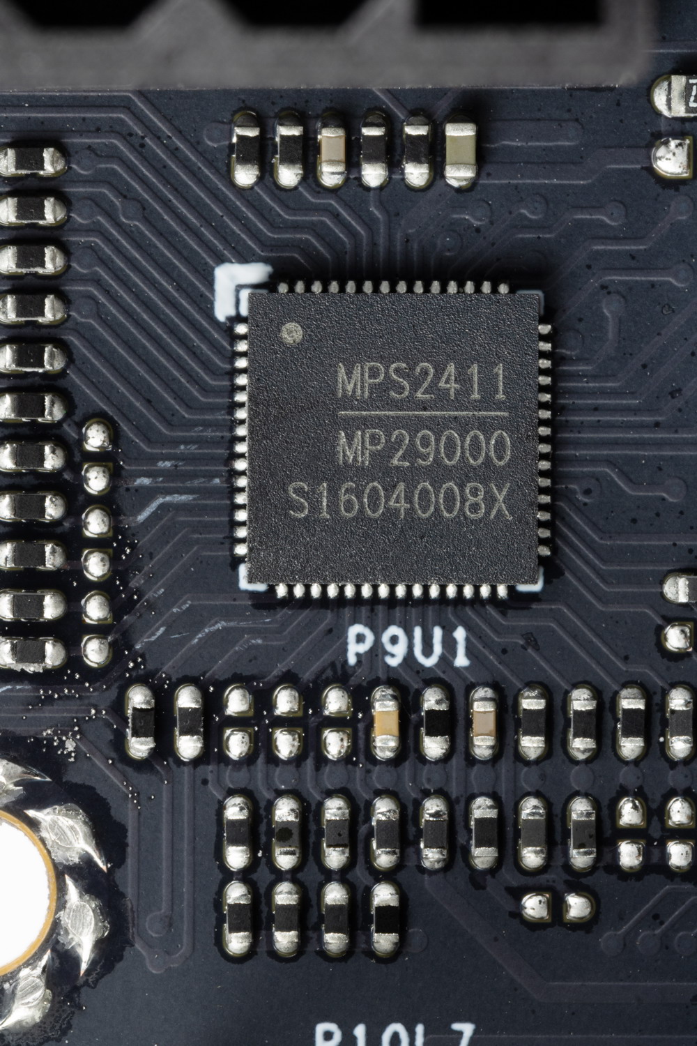 Управление всей схемой возложено на ШИМ-контроллер MP29000 от MPS (он поддерживает до 8 фаз, поэтому фазы питания VCore идут по параллельной схеме 5х2, плюс три остальные фазы, всего реально задействовано 8 фаз).