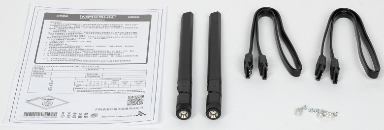 В комплект поставки входят: краткая карточка с QR-кодом для скачивания руководства пользователя, кабели SATA, пара антенн встроенного Wi-Fi-модуля, запасные стойки и винтики для слотов M.2.