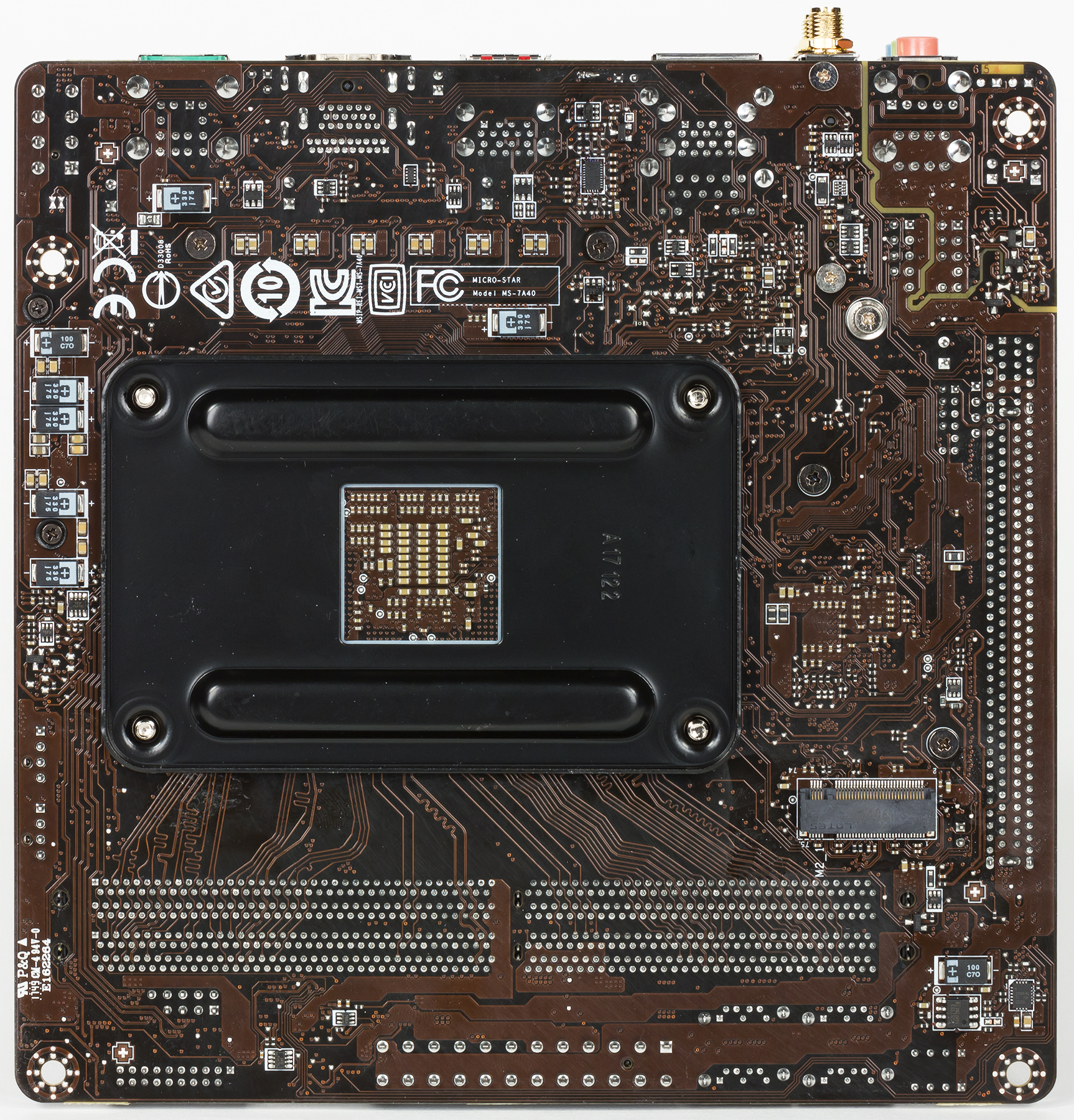 Формат Mini-ITX предусматривает всего один слот расширения обычного формата — вот один PCIe 3.0 x16 здесь и установлен. При установке любых APU или Athlon он превратится в х8, но работать будет. Кроме него на обратной стороне платы присутствует разъем M.2 M-Key, предназначенный для установки твердотельных накопителей типоразмера 2280. Более короткие или длинные варианты не поддерживаются, что, впрочем, проблемы не составляет: 90% продающихся в розницу SSD с разъемом M.2 — это как раз 2280. Подключен этот разъем непосредственно к процессору и поддерживает устройства PCIe 3.0 x4 (только в паре с Ryzen — иначе х2) и SATA.