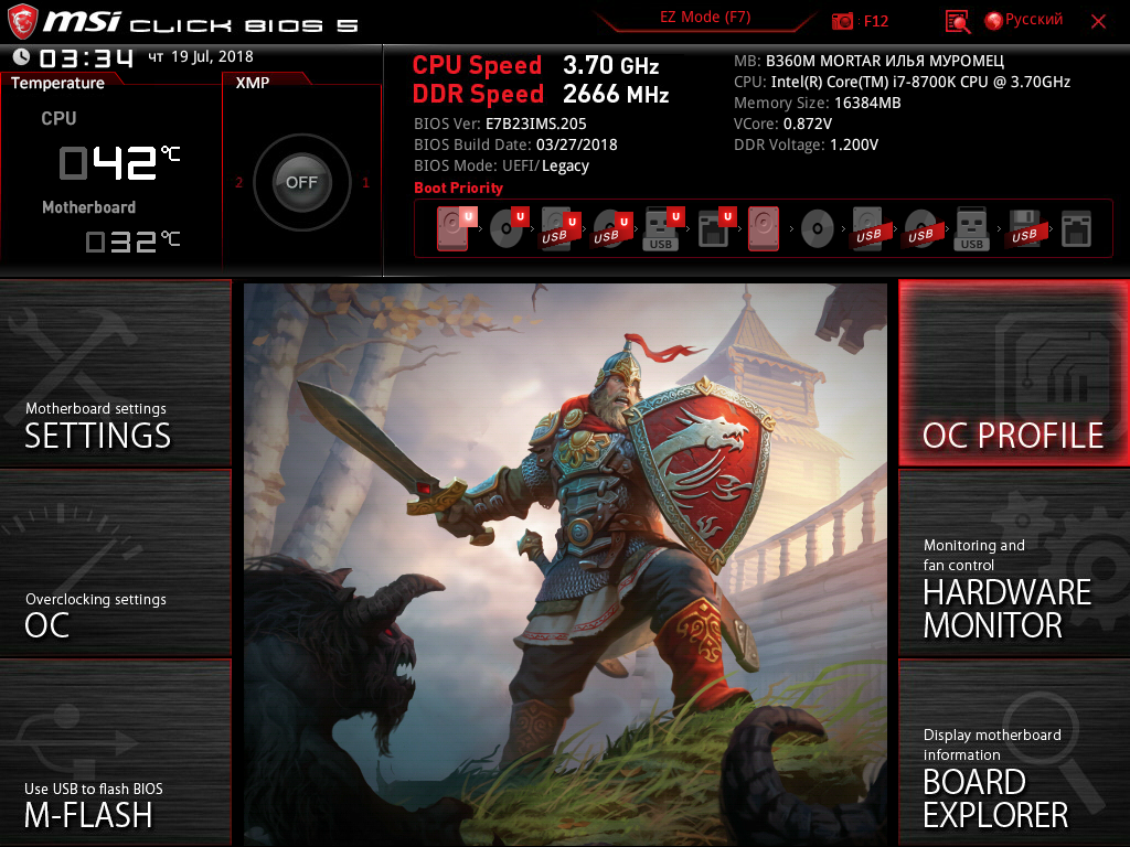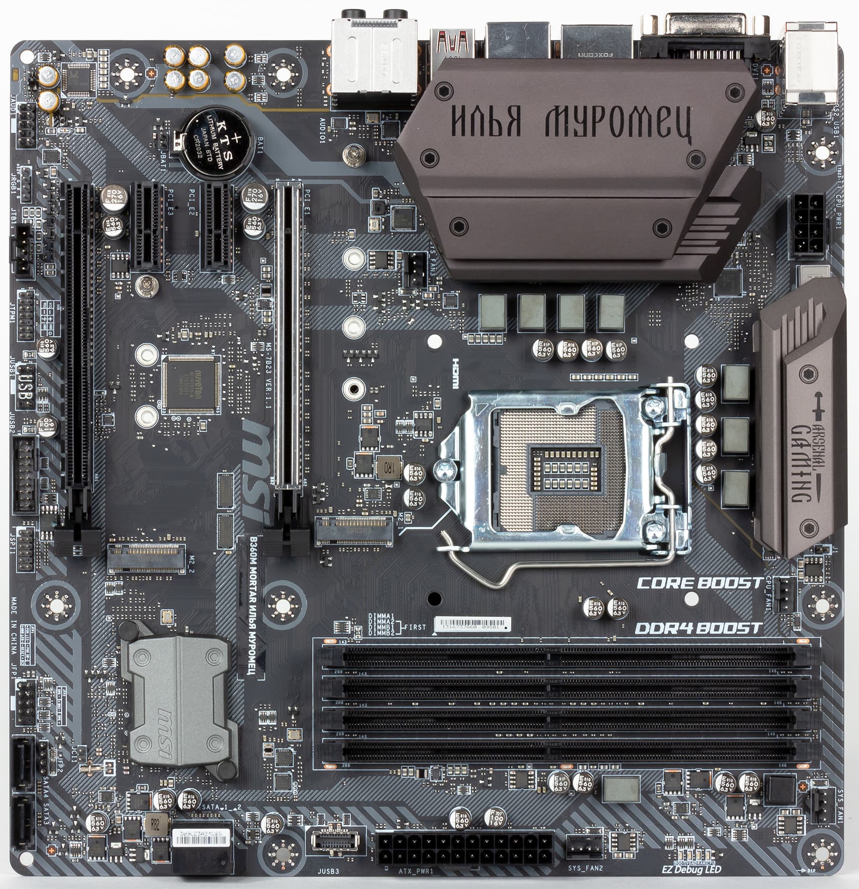 Компания MSI представила новую игровую материнскую плату MSI B360M Mortar Илья Муромец. Разумеется, плата, названная в честь былинного русского богатыря Илья Муромца, ориентирована исключительно на российский рынок. Однако в ассортименте компании есть также новая плата MSI B360M Mortar Titanium, и фактически платы MSI B360M Mortar Titanium и MSI B360M Mortar Илья Муромец отличаются лишь расцветкой: в варианте Titanium текстолит платы покрашен в светло-серый цвет. В остальном это две абсолютно одинаковые платы, и хотя в этом обзоре мы рассмотрим именно плату MSI B360M Mortar Илья Муромец, все сказанное о ней можно в равной степени отнести и к плате MSI B360M Mortar Titanium.