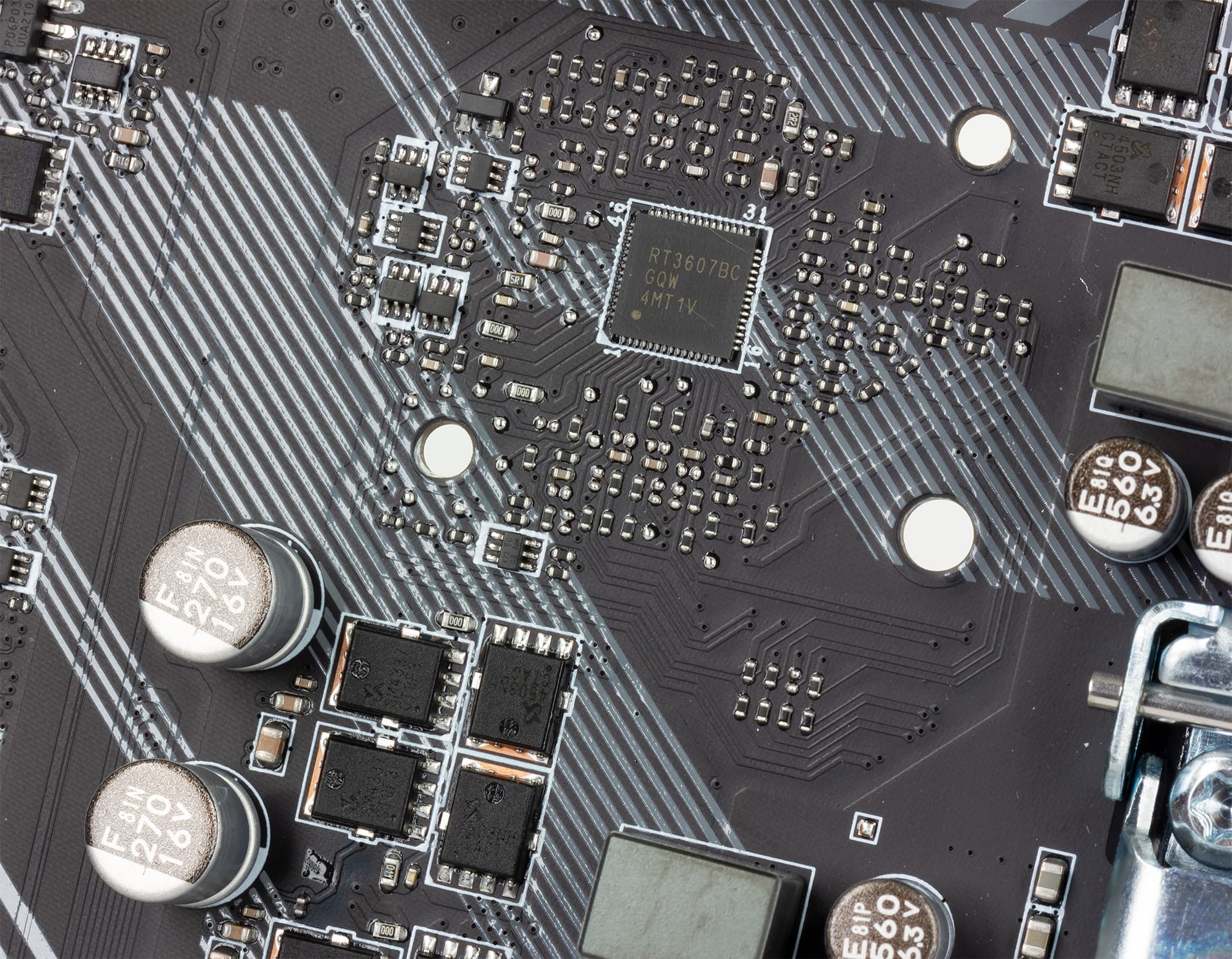 Управляется регулятор напряжения питания шестифазным (4+2) двухканальным контроллером RT3607BC от компании Richtek Technology. Данный контроллер обеспечивает 4/3/2 фазы для ядер процессора (Vcore) и 2 фазы для графического ядра процессора.