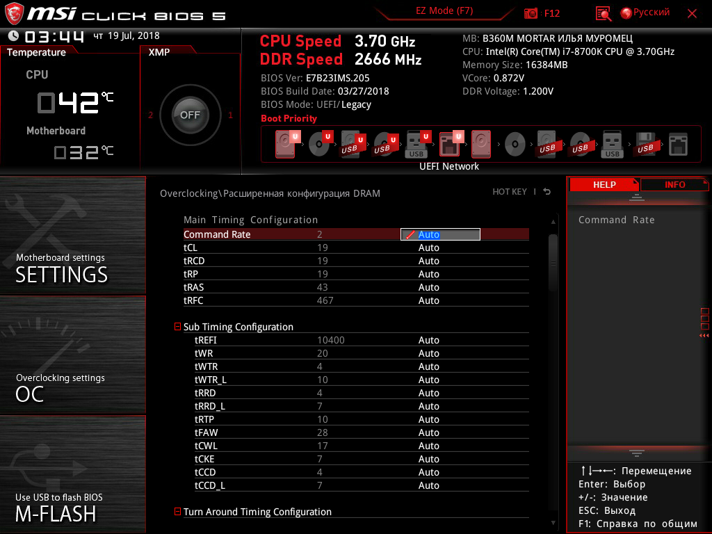 Теперь о возможностях по настройке платы MSI B360M Mortar Илья Муромец через UEFI BIOS. Собственно, здесь все стандартно и малоинтересно, поскольку чипсет Intel B360 не позволяет (или почти не позволяет) разгонять процессор и память.
