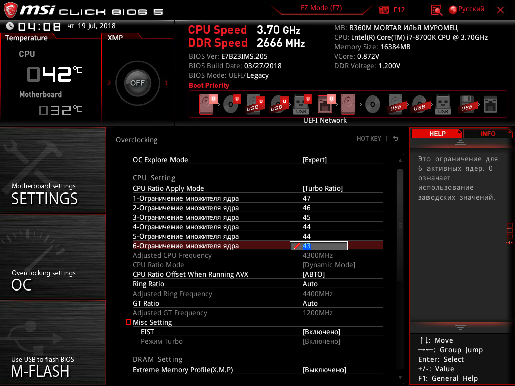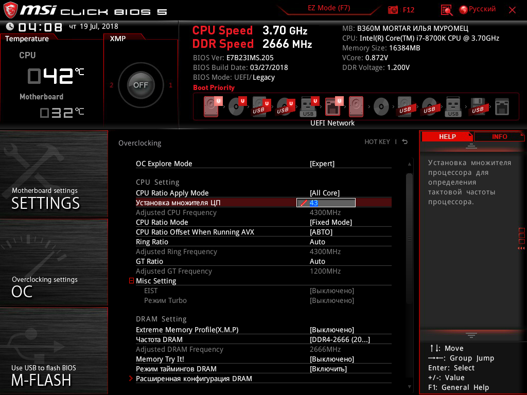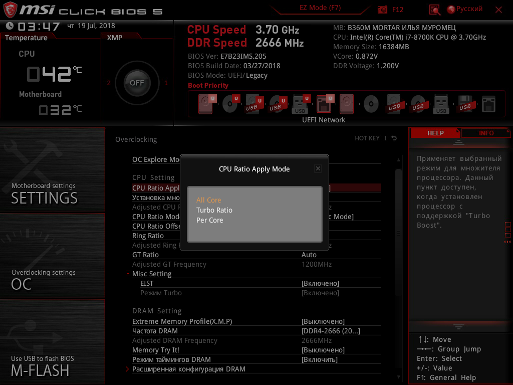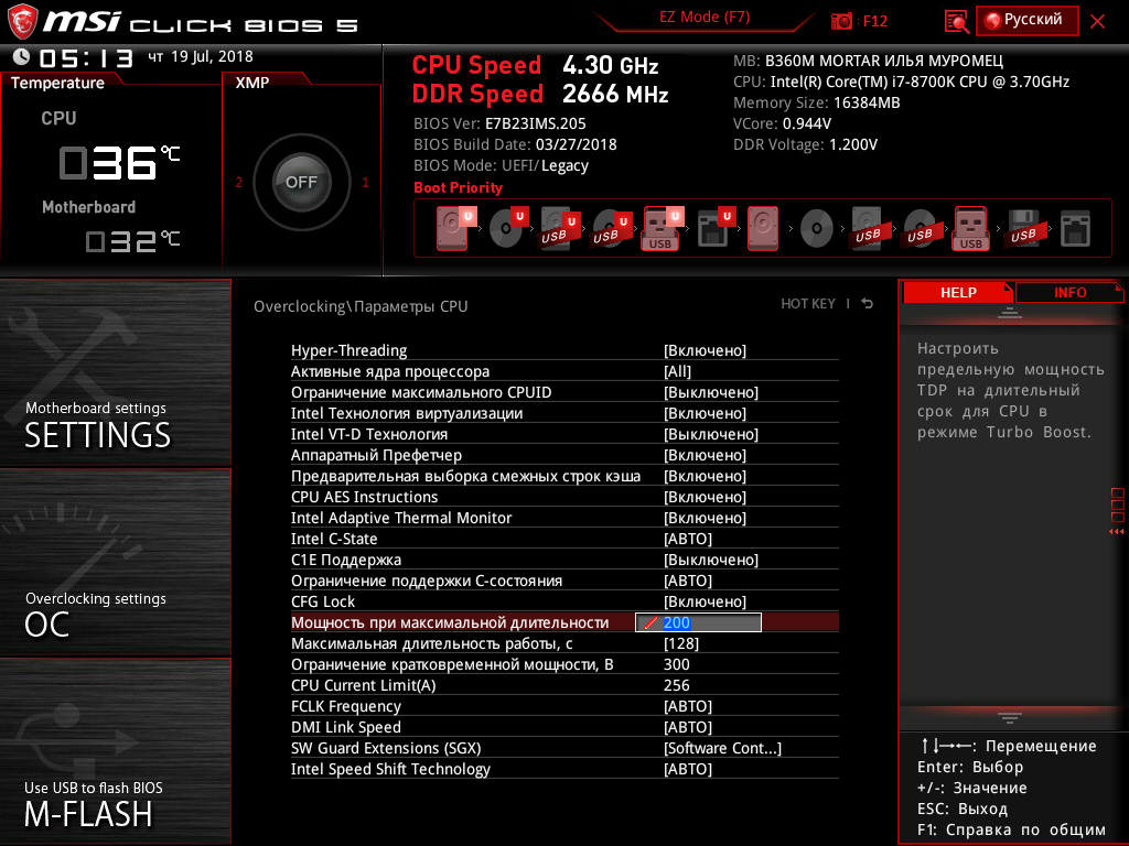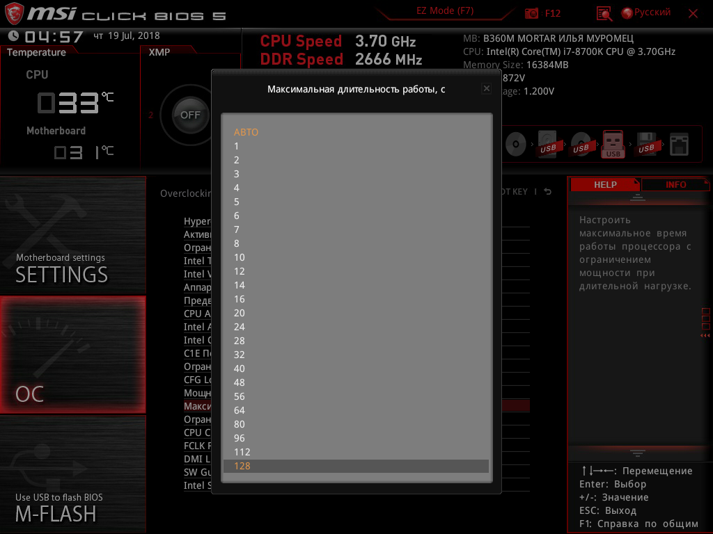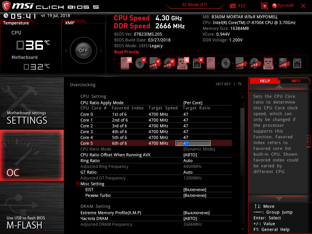 Итак, посмотрим, какие же минимальные возможности для увеличения производительности путем разгона системы доступны на плате MSI B360M Mortar Илья Муромец.