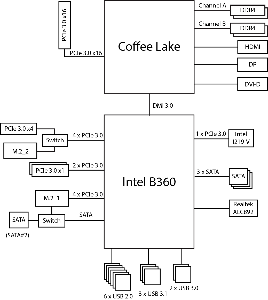 Мы уже писали об особенностях чипсета Intel B360 и сравнивали его с остальными чипсетами Intel 300-й серии, так что повторяться не будем. Напомним лишь, что чипсет Intel B360 имеет 24 HSIO-порта: до 12 портов PCIe 3.0, до 6 портов SATA, до 4 портов USB 3.1 и до 6 портов USB 3.0, но так, чтобы общее количество портов USB 3.1 и USB 3.0 не превосходило 6.