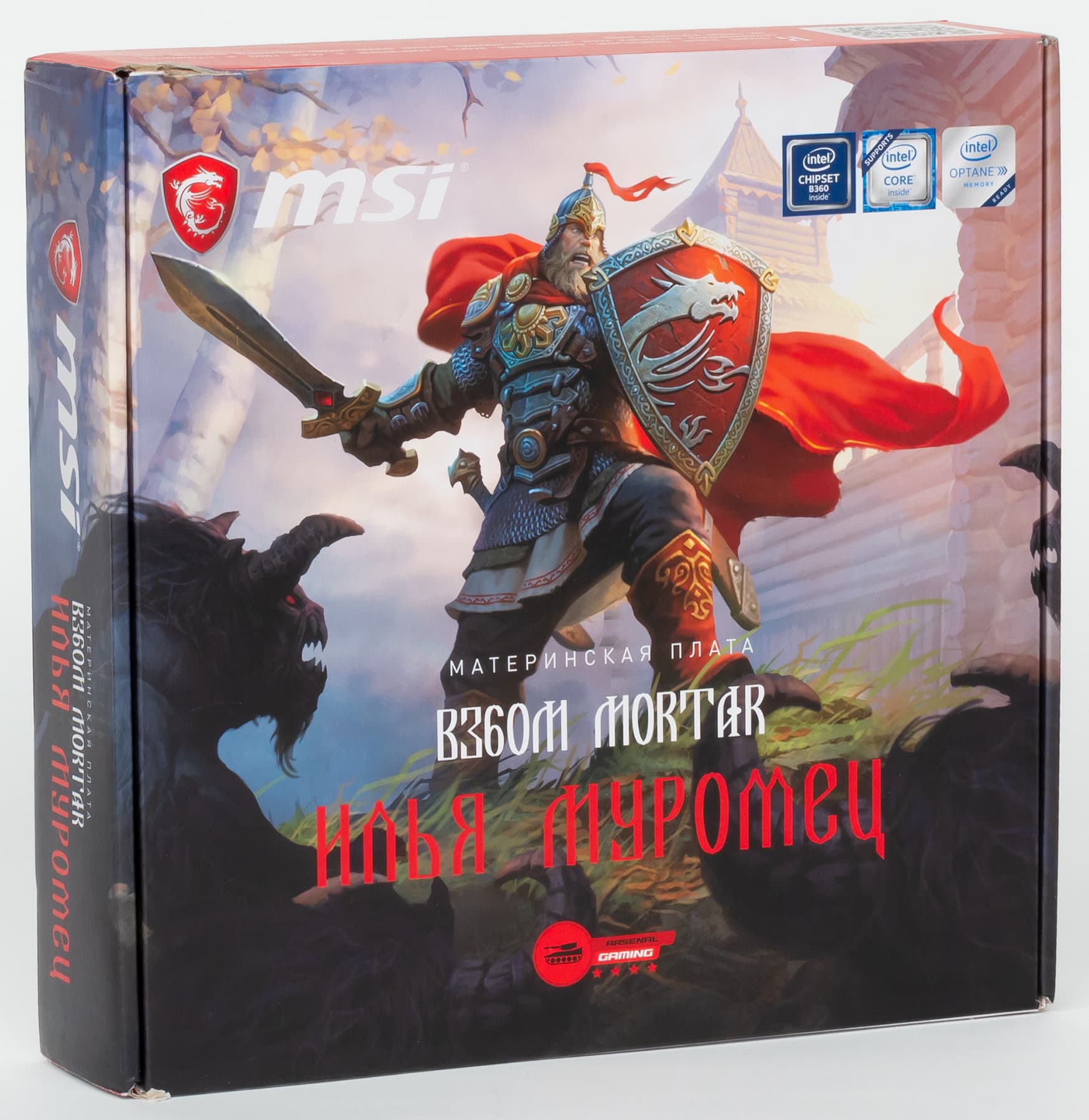 Плата MSI B360M Mortar Илья Муромец поставляется в компактной коробке с изображением русского богатыря.