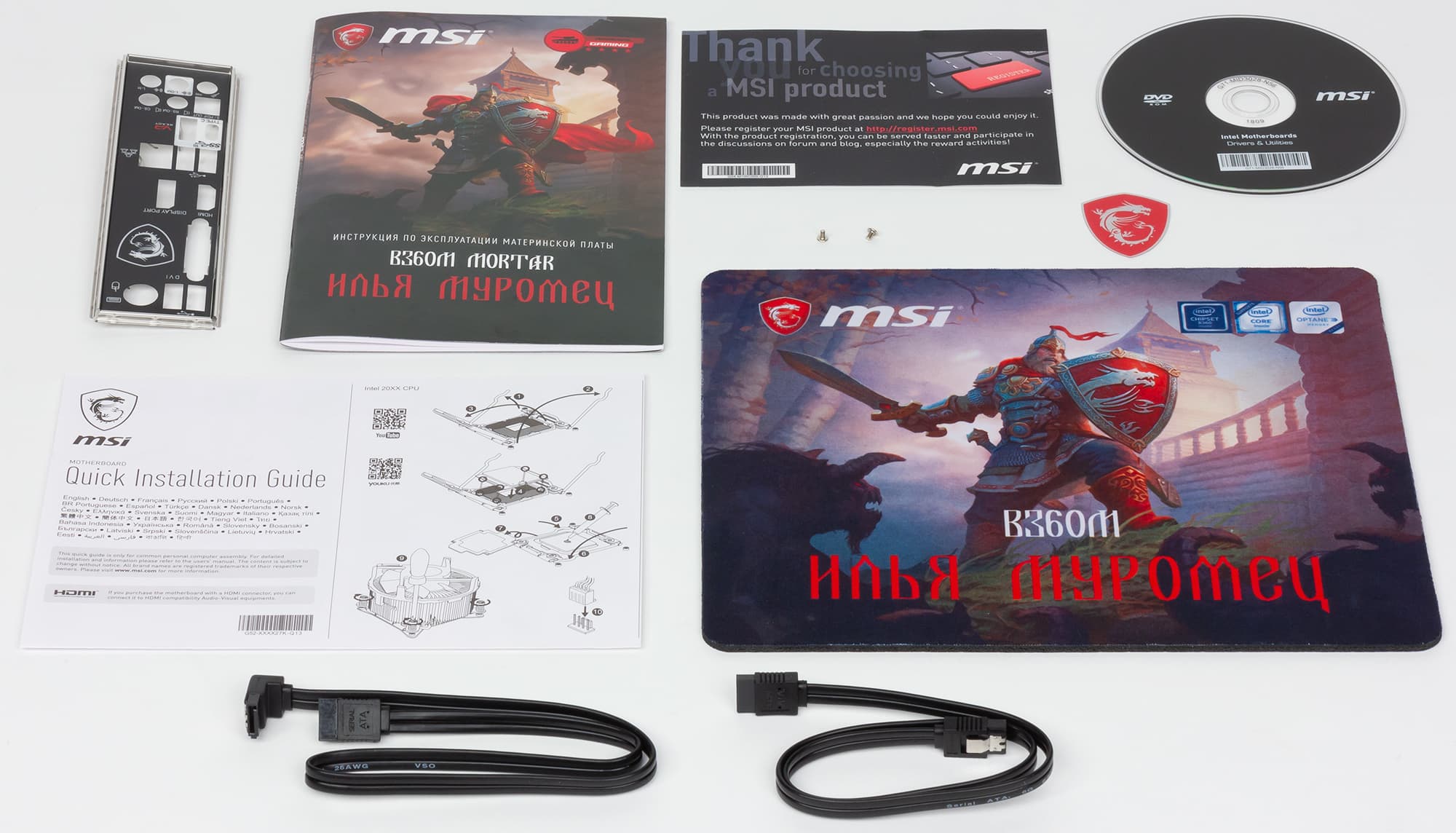 Комплект поставки включает в себя руководство пользователя на русском языке, два SATA-кабеля (все разъемы с защелками, один кабель имеет угловой разъем с одной стороны), DVD-диск с драйверами, а также стикер для корпуса и коврик для мыши с названием платы и изображением Илья Муромца.