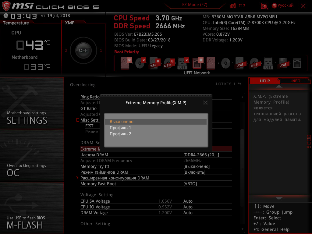 Кроме того, можно активировать XMP-профиль памяти, но, опять-таки, частота памяти не будет превосходить 2666 МГц (XMP-профиль отразится лишь на таймингах и напряжении питания памяти).