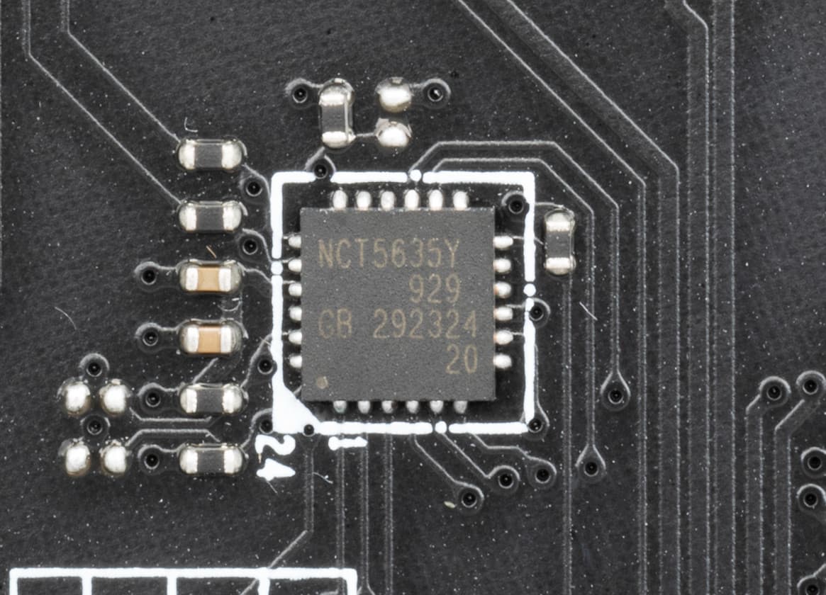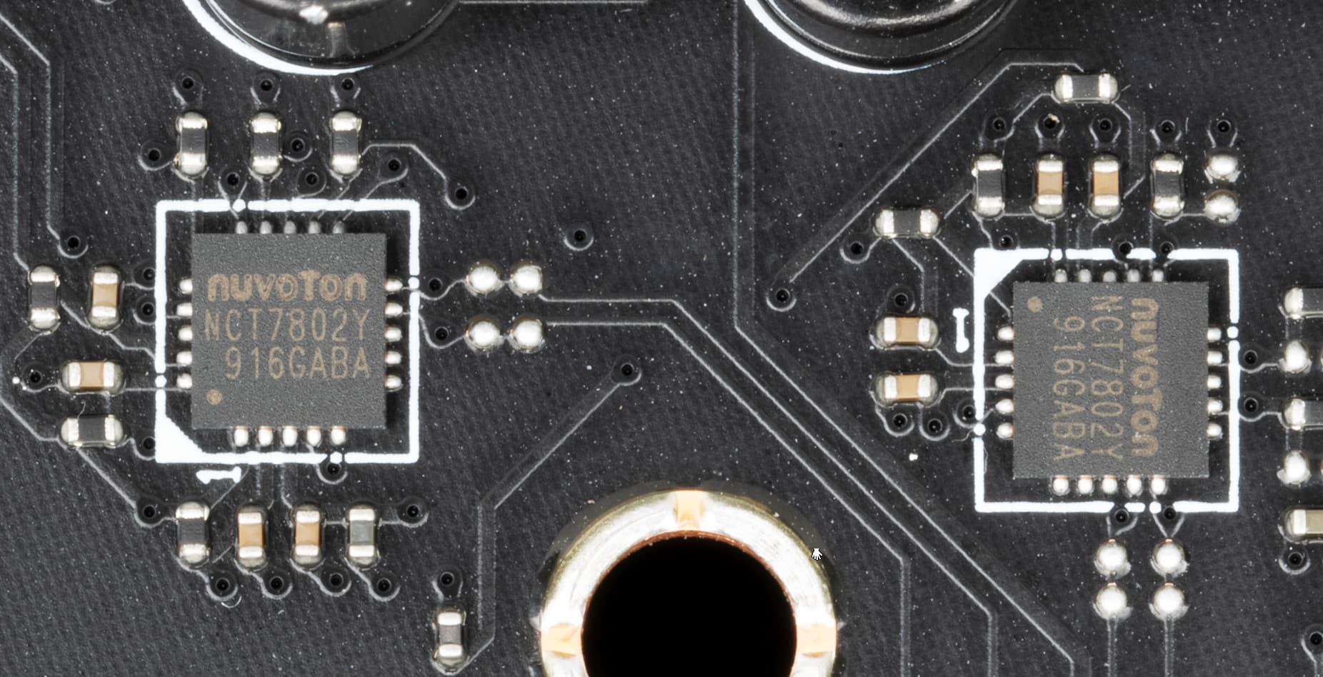 Именно поэтому радиатор TRX40 и не нагревается очень сильно (обеспечивая малошумный режим вращения вентилятора). Мосфеты от схемы питания SoC имеют свой небольшой радиатор, прикрепляющийся к радиатору у задней панели и по сути получающий также охлаждение от вентилятора на TRX40.
