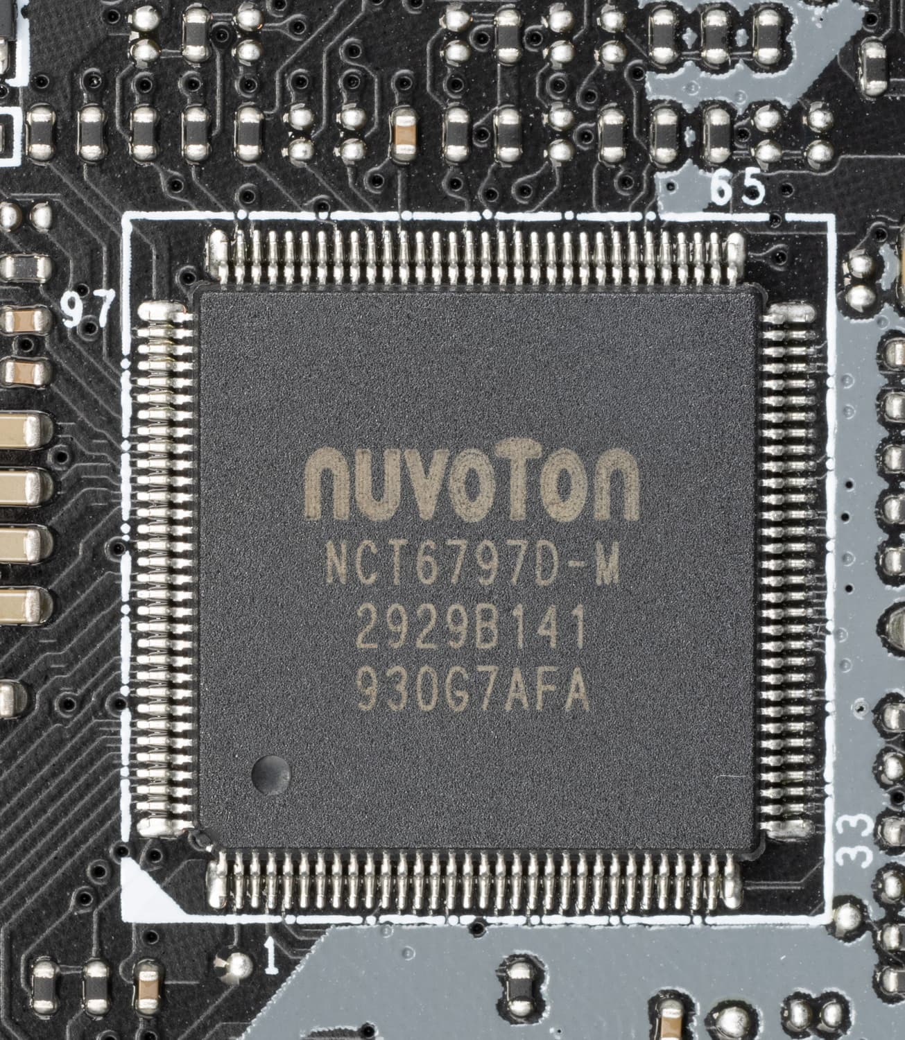 На оборотной стороне элементы имеются, в частности, ряд усилителей сигнала для шины PCI-E, некоторые контроллеры и другая мелкая логика. Обработан текстолит неплохо: во всех точках пайки срезаны острые концы срезаны. Особого упоминания заслуживают места, помеченные белой краской: тут плата может прижиматься к имеющимся в корпусах дополнительным втулкам крепежа, и потому здесь на плате нет никаких контактов или элементов логики, которые могут быть замкнуты или повреждены при установке матплаты в такие корпуса.