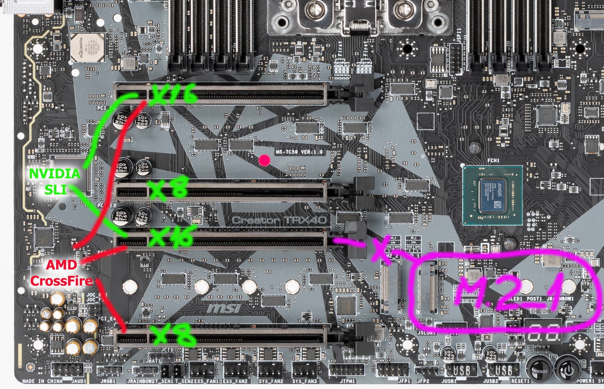 А теперь пойдем по периферии. Начнем со слотов PCI-E, их «кормит» не чипсет TRX40, а процессор.