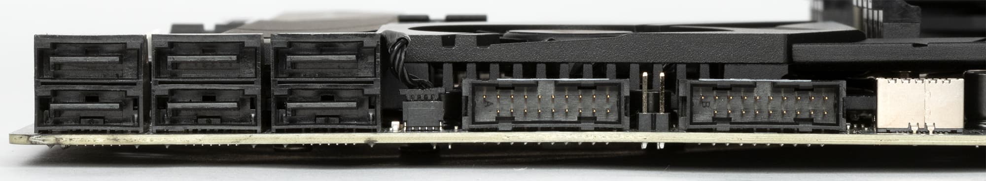 Всего у платы 6 разъемов Serial ATA 6 Гбит/с + 3 слота для накопителей в форм-факторе M.2. (Еще один слот M.2, спрятанный под кожухом блока разъемов задней панели, занят контроллером беспроводных сетей Wi-Fi/Bluetooth.). Все 6 портов SATA реализованы через чипсет TRX40 (4 порта — штатно, а еще два — путем заимствования свободных PCI-E линий).
