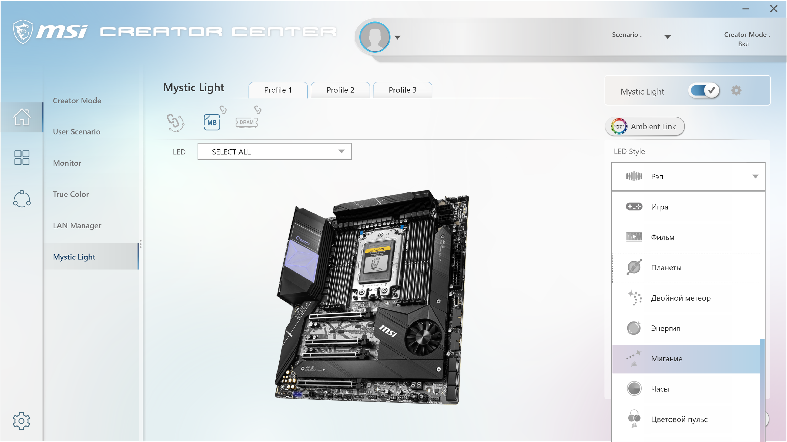 Управление подсветкой теперь тоже внутри этой программы (ранее Mystic Light была отдельной утилитой). Вариантов эффектов весьма много.
