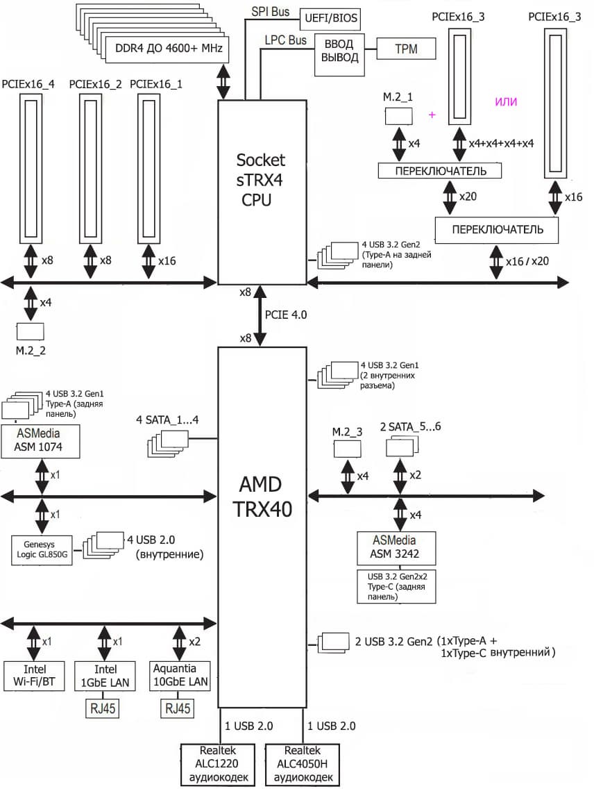 В свою очередь чипсет TRX40 обладает 24 линиями PCI-E 4.0, их которых опять же 8 зарезервированы для связи чипсета с процессором (остается свободных — 16). Далее 8 линий — свободно конфигурируются (на волю производителей матплат) (остается свободных — 8). Оставшиеся линии могут пойти либо на 8 портов SATA, либо из них можно сконфигурировать любые комбинации слотов PCI-Ex1, PCI-Ex2, PCI-Ex4. Разумеется, и тут есть выбор у производителей материнок.