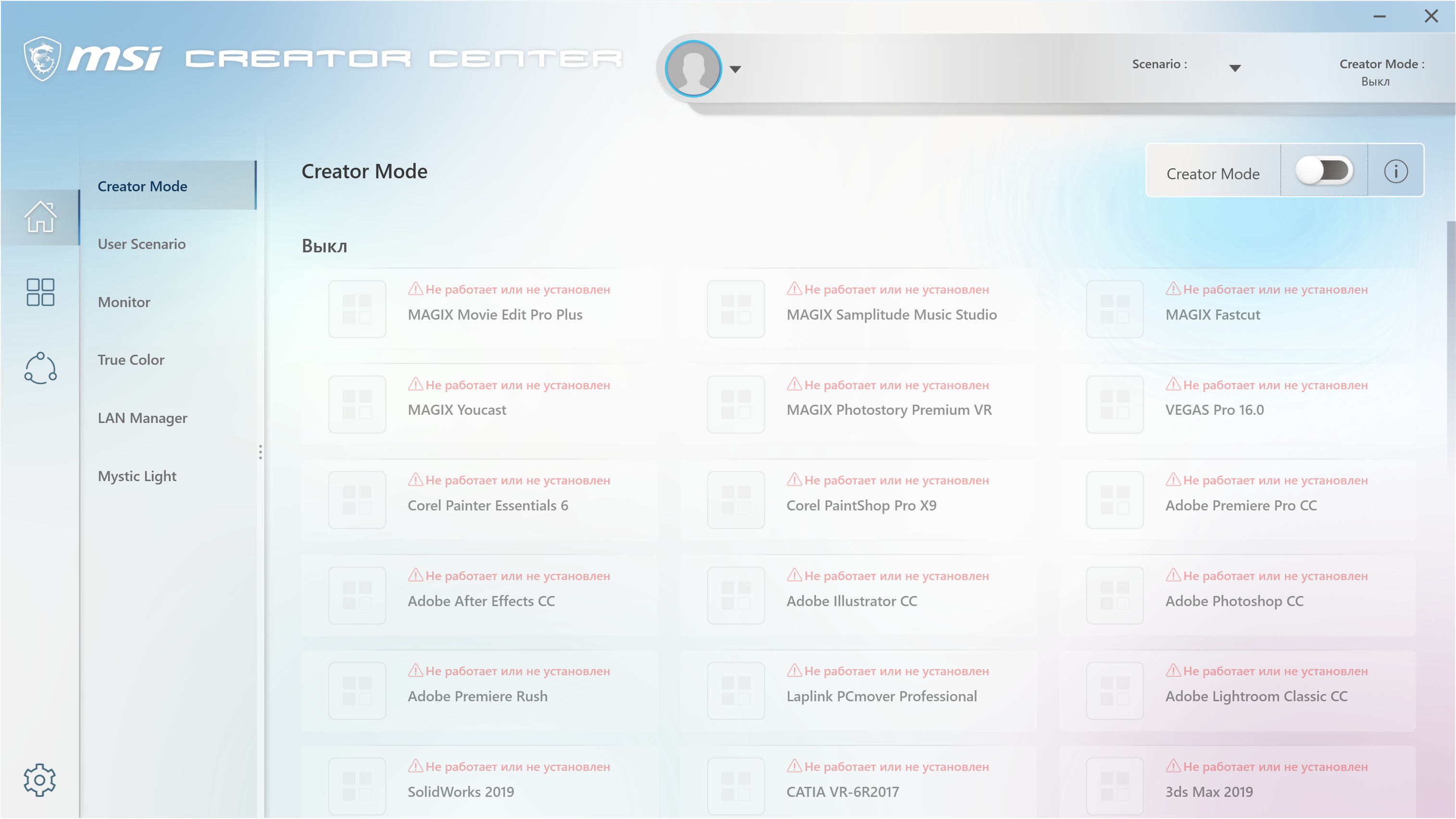 Поскольку у материнской платы особое позиционирование, а как-то сложно через аппаратный набор точно передать: материнка для создания контента или для игр, то особая роль уделяется оптимизации работы ПО. Поэтому в данной утилите имеется режим работы Creator Mode, при этом идет поиск установленных программ по редактированию, монтажу и т. д. и предлагаются варианты оптимизаций, нацеленных или на максимальное быстродействие того или иного пакета, или на низкое энергопотребление (низкий шум СО), или на четкое разграничение количеств ядер, которые могут использовать те или иные программы по созданию контента.