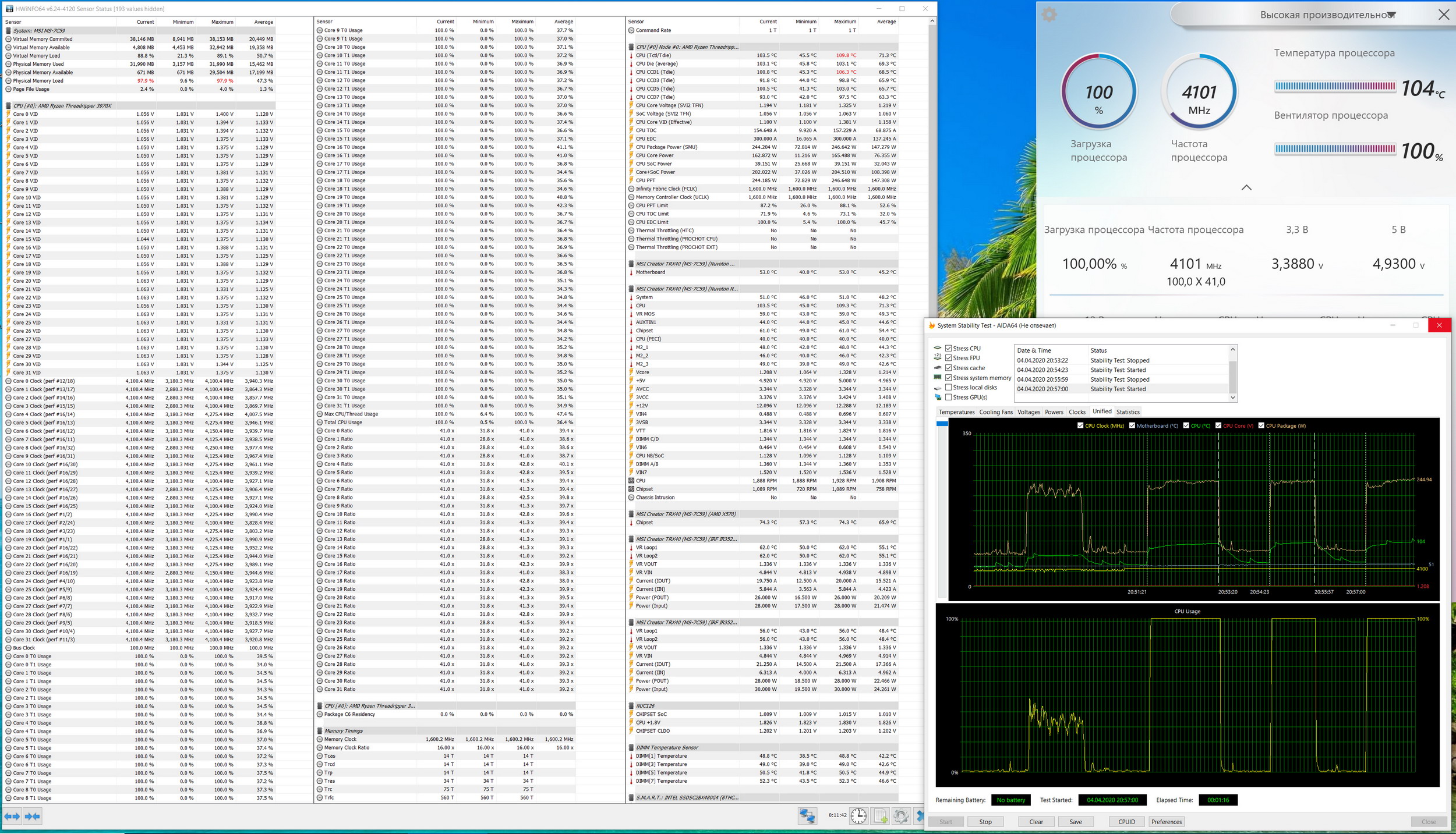 Утилита выставила по всем 32 ядрам единую частоту 4.1 ГГц. Именно по всем ядрам! Жесткие тесты не привели к снижению частот, однако рост температуры CPU выше 100 °C меня заставил волноваться (еще бы — это единственный сэмпл Threadripper 3970X в России! А в продаже он стоит.. ой, не буду даже...). Когда увидел 104 °C — мне поплохело. Утилита MSI, судя по всему, вырубила AMD Precision Boost! Потому что эта технология разгоняет процессоры, но при условии нагрева не выше 95-96 °C!! Остальные параметры работы материнской платы были в норме: посмотрите, чипсетный вентилятор включался максимум на 1090 оборотов в минуту (все же прекрасно спроектировали систему охлаждения спецы из MSI!). До запуска тестов AIDA я успел все же снять показания со своих тестов в этом режиме: