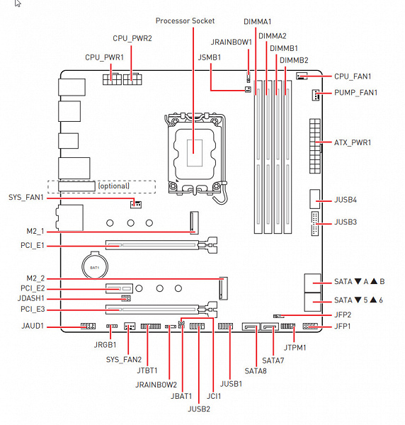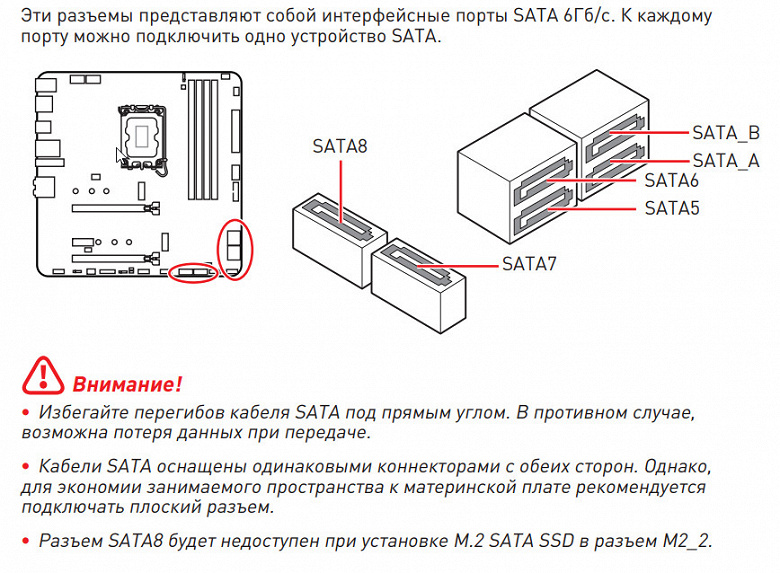 Порты SATA странно промаркированы, начиная с 5 ( 5, 6, 7, 8), 4 из них реализованы через чипсет B660 и поддерживают создание RAID. При этом порт SATA 8 делит ресурсы с портом М.2_2.