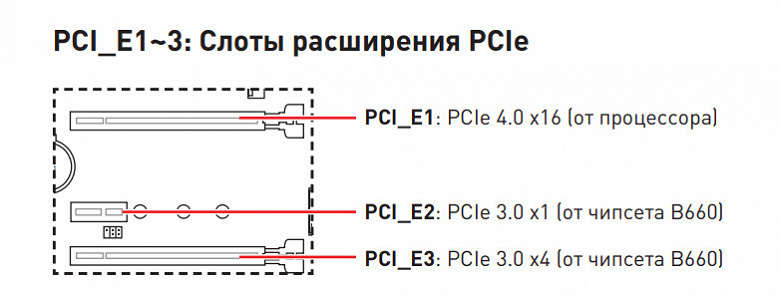 Кроме USB-портов, к которым мы подойдем позже, чипсет B660 обладает 14 PCIe линиями и 4 портами SATA. Считаем, сколько линий уходит на поддержку (связь) с тем или иным элементом (надо учитывать, что 14 линий не единой версии, а 6 линий PCIe 4.0 и 8 линий PCIe 3.0):