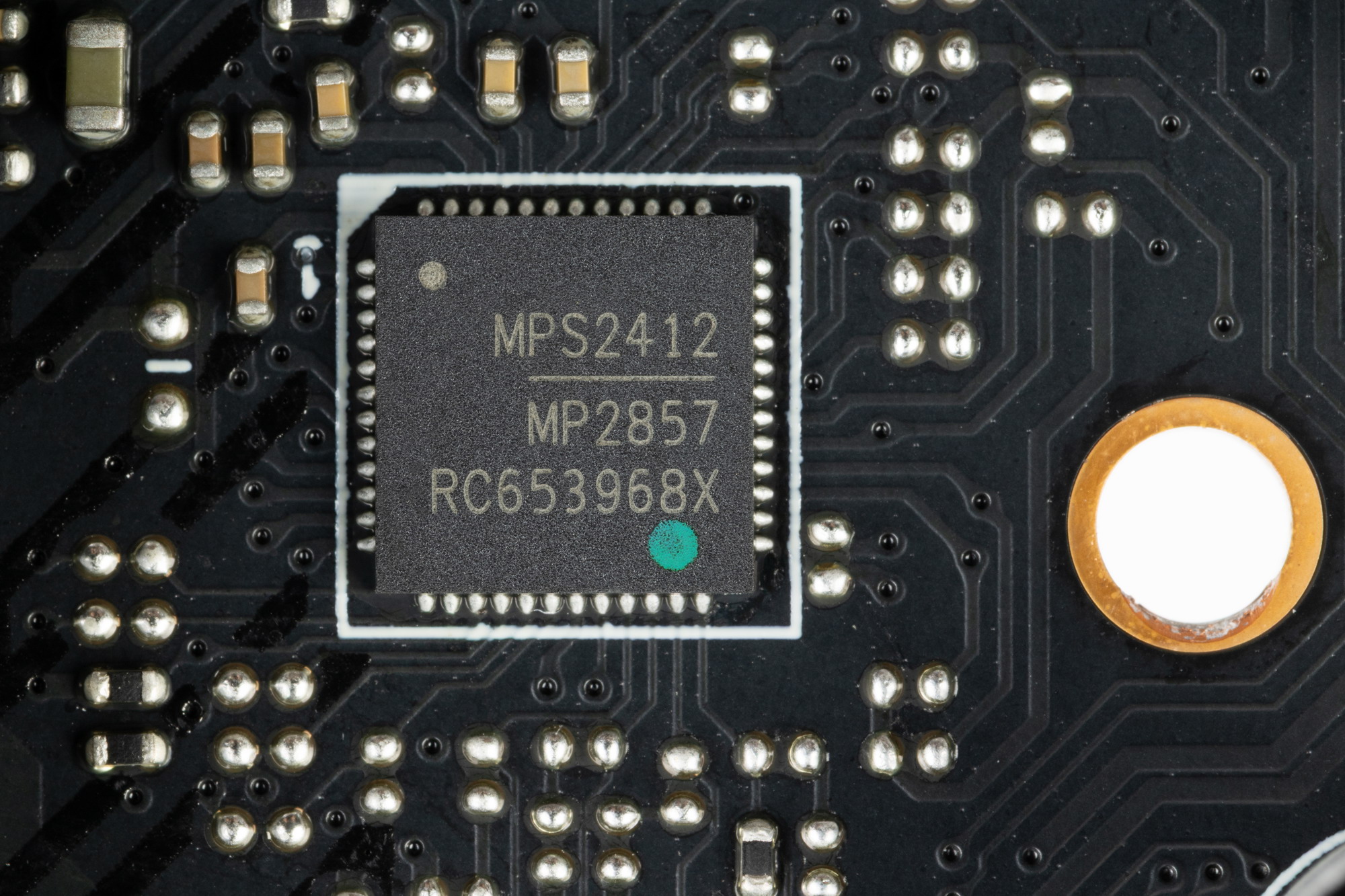 Управляет этими наборами фаз VCore и SoC (14+2) ШИМ-контроллер MP2857 от того же производителя MPS.