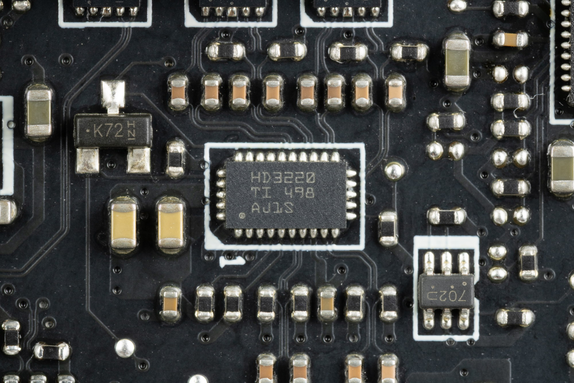 Аудиотракт вынесен на угловую часть платы, не пересекается с другими элементами. У платы на задней панели два универсальных разъема по приему и выводу сигналов плюс оптический S/PDIF.