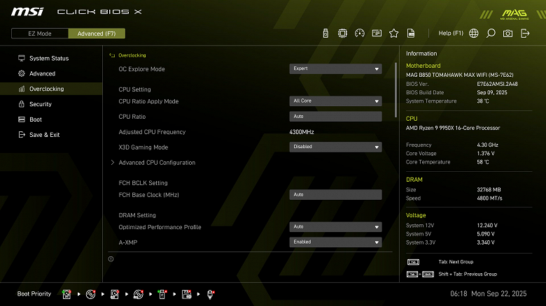 Еще раз повторю, что многое в авторазгоне зависит от системы питания. Все ШИМ-контроллеры программируемые, вся информация о них – в UEFI BIOS, откуда и приходят режимы работы CPU в том или ином случае. Разумеется, данная матплата уже поддерживает новый режим работы Turbo Mode X3D, этот режим работает только на процессорах 9xxx X3D и связан с отсечением рабочих ядер без дополнительного кеша, чтобы оставшиеся ядра смогли работать на более высоких частотах, поднимая тем самым общую игровую производительность в разрешениях, где нет упора в видеокарты. Для нужд тестлаба по материнским платам мы не имеем таких процессоров, поэтому на практике проверить не можем.