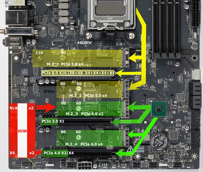 Итак, кроме USB-портов, к которым мы подойдем позже, чипсет B850 обладает 12 PCIe линиями. Считаем, сколько линий уходит на поддержку (связь) с тем или иным элементом: