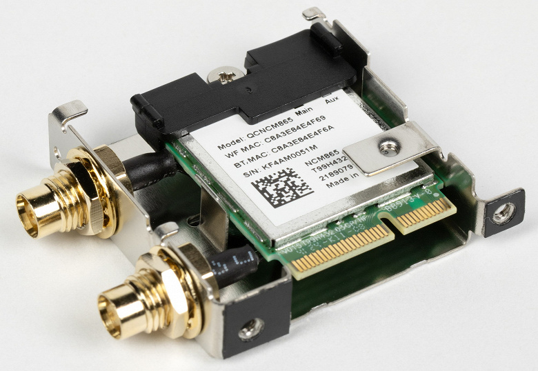 Имеется и комплексный беспроводной адаптер на контроллере Qualcomm QCNCM865, через который реализованы Wi-Fi 7 (802.11a/b/g/n/ac/ax/be, 2,4/5/6 ГГц) и Bluetooth 5.4. Он установлен в слот M.2 (E-key), и его разъемы для выносных антенн выведены на заднюю панель.